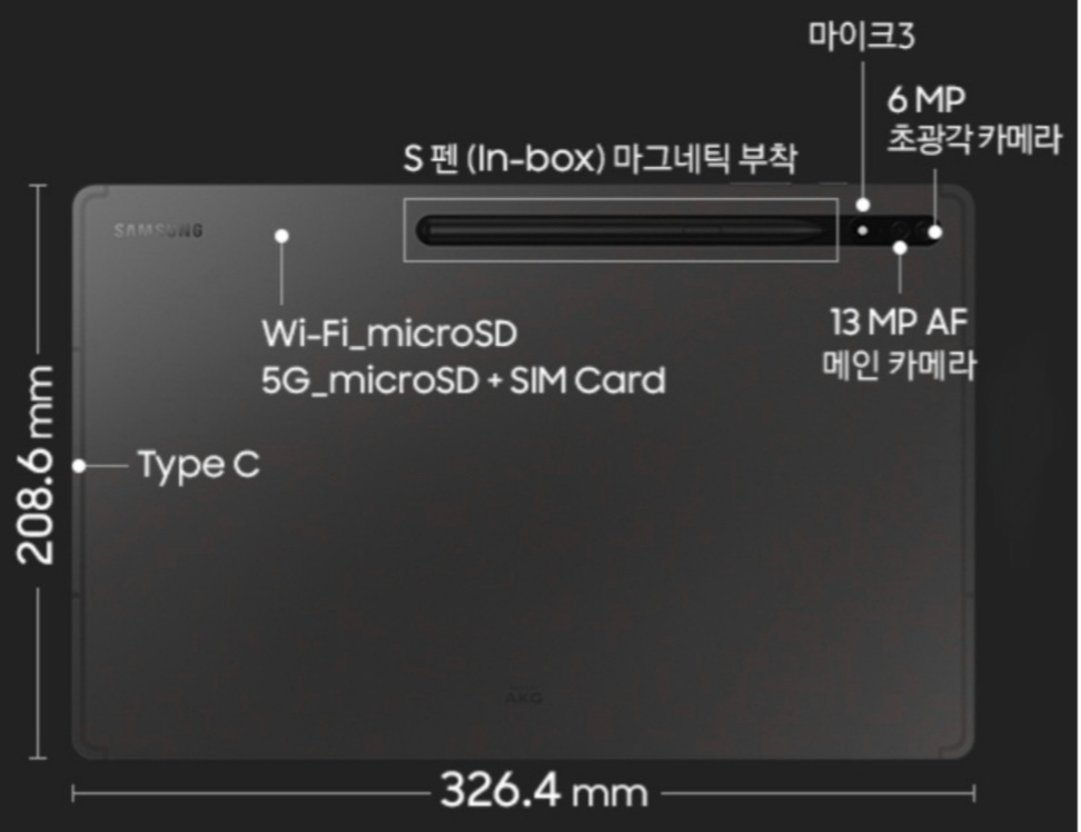 무게는 726g(Wi-Fi), 728g(5G)로 갤럭시탭 S8 시리즈 중 제일 무겁게 출시했지만 반대로 두께는 5.5mm로 갤럭시탭 S8 시리즈 중 제일 얇게 출시했습니다