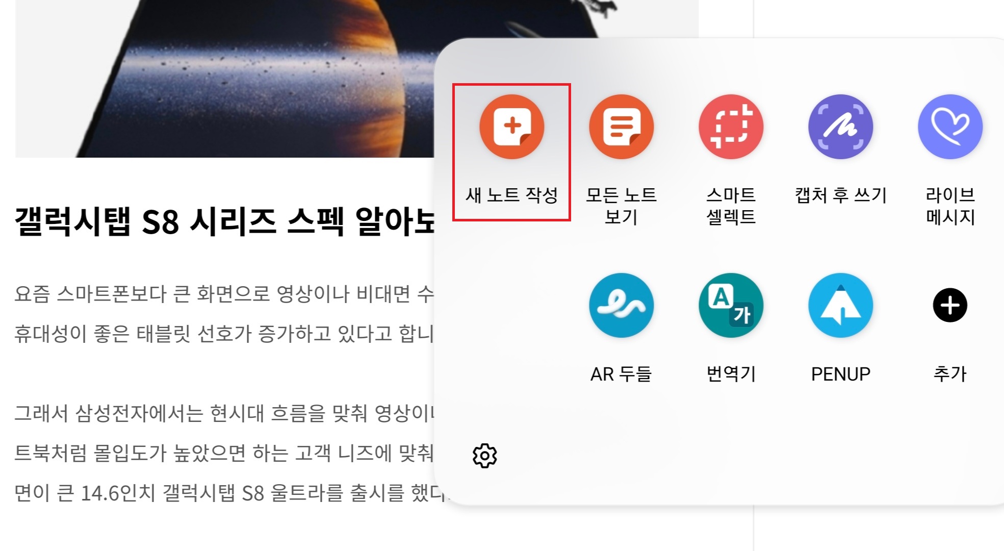 삼성 인터넷으로 검색하면서 공부를 하다가 좋은 정보, 내용을 얻었다면 S Pen 갤럭시탭 화면에 대고 S Pen 버튼을 클릭하면 에어 커맨드 기능이 활성화됩니다. 많은 기능 중 새 노트 작성을 클릭합니다.