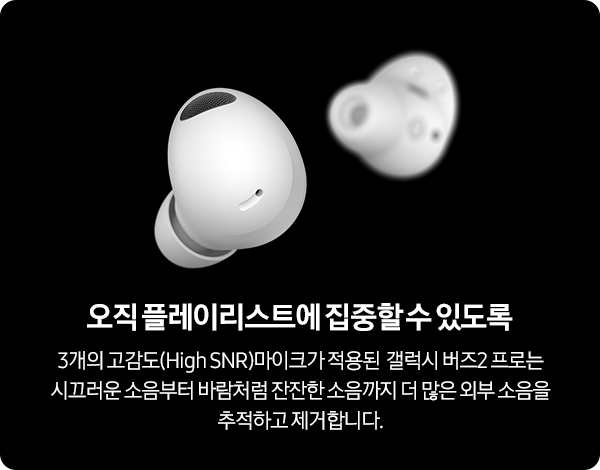 ▼버즈2 프로는 3개의 High-SNR 마이크 시스템이 적용되어 시끄러운 상황 속에서도 잡음을 잡아주고 나의 목소리를 상대방한테 더욱 깨끗하고 또렷하게 전달할 수 있게 도와줍니다.