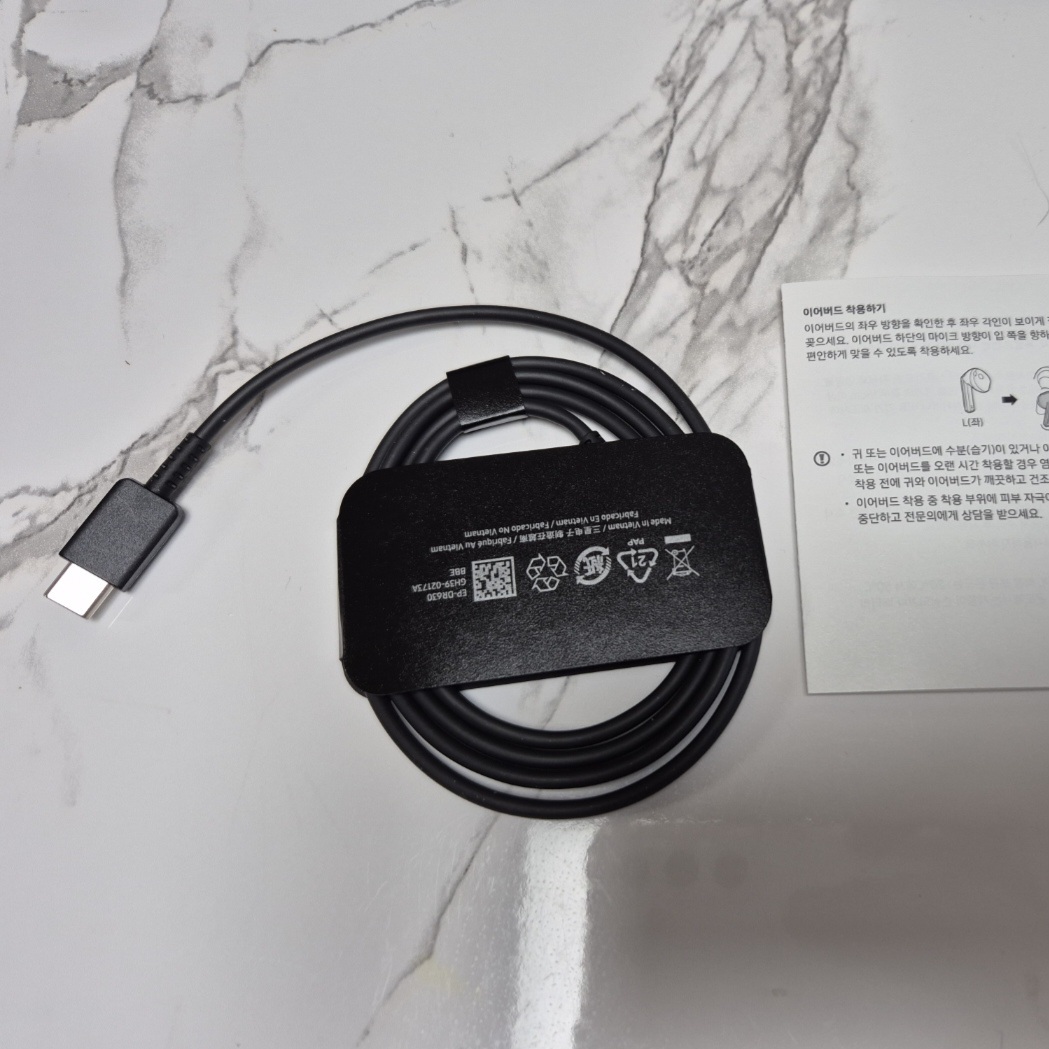 우선 갤럭시 버즈3부터 뜯어보았는데요. 구성품으로 간단 설명서와 케이블이 들어있었고 기본 갤럭시버즈3 충전 케이스 안에 갤럭시이어버드가 들어있었답니다.