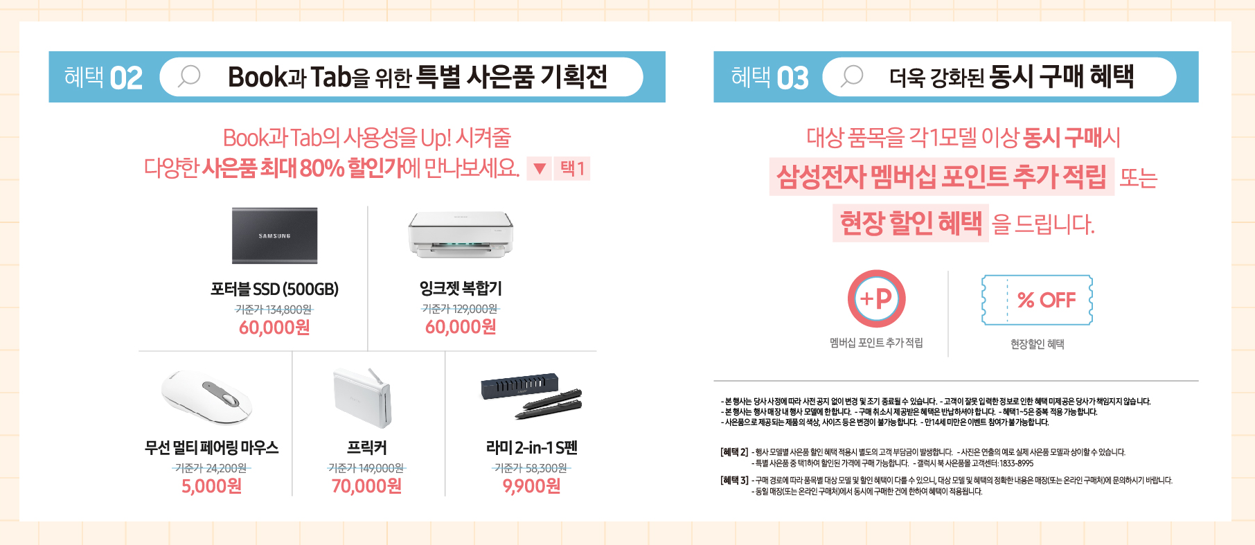 ▼갤럭시 북과 갤럭시 탭을 위한 특별 사은품 기획전 및 더욱 강화된 동시 구매 혜택으로 갤럭시 북 혹은 갤럭시 탭을 구매하면 포터블 SSD (500GB), 잉크젯 복합기, 무선 멀티 페어링 마우스, 프릭커, 라미 2-in-1S펜을 최대 80% 할인 가격에 구매할 수 있고 갤럭시 북과 갤럭시 탭을 동시 구매 시 기존 동시 구매 혜택보다 저렴한 가격에 구매할 수 있다고 합니다.