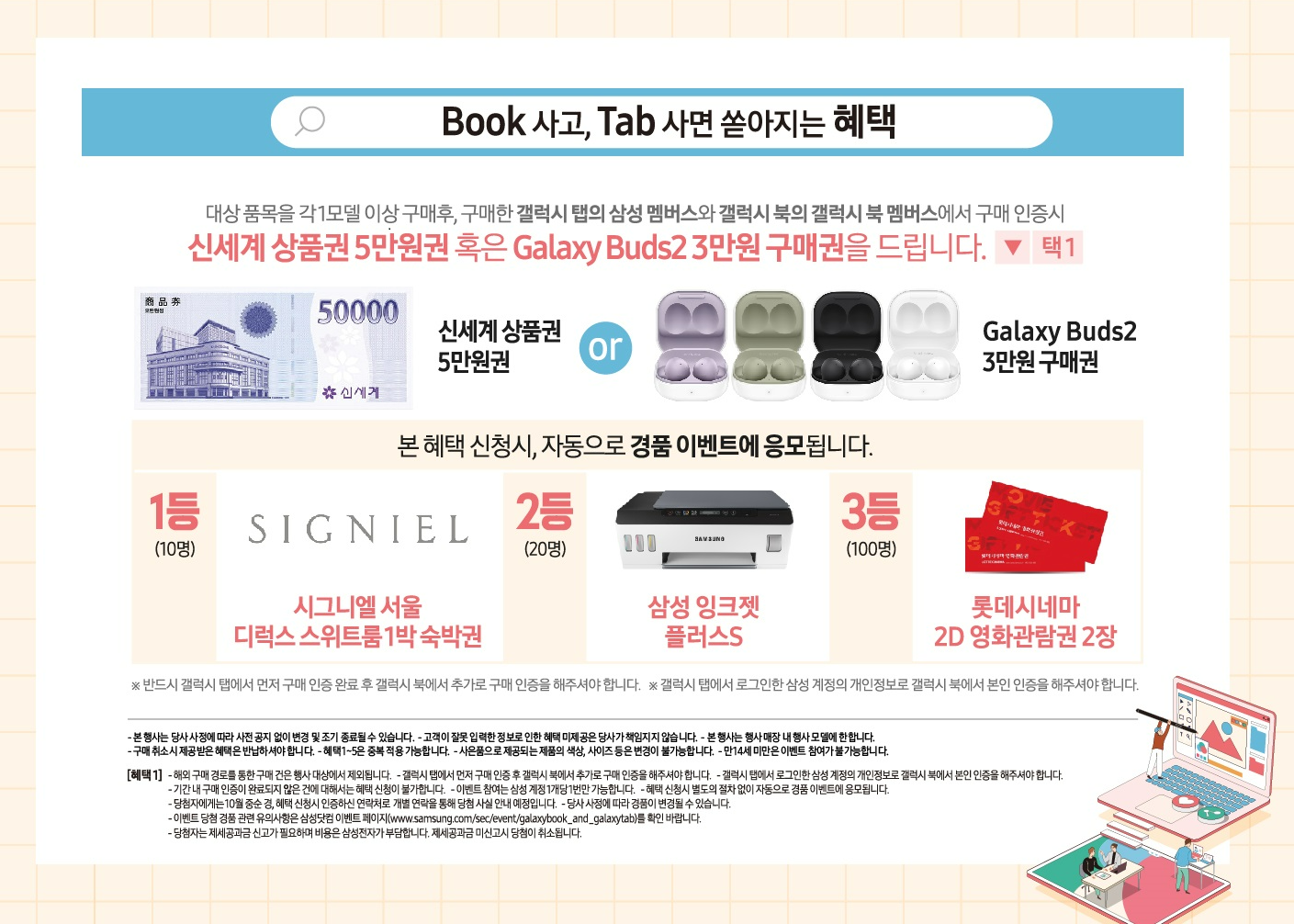 ▼갤럭시 북 치기 탭 치기 이벤트 첫 번째 혜택으로 대상 모델 갤럭시 북 및 갤럭시 탭을 동시 구매 시 드리는 혜택이며, 구매 후 구매한 갤럭시 탭의 삼성 멤버스와 갤럭시 북의 갤럭시 북 멤버스에 구매 인증을 하면 신세계 상품권 5만원권 혹은 갤럭시 버즈 2 3만 원 구매권을 드린다 고합니다.