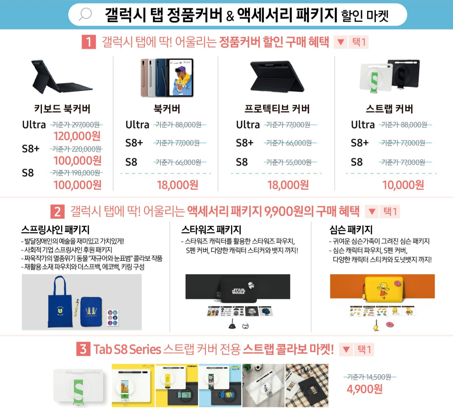 ▼갤럭시 탭 해당 모델 구매 시 정품 커버 키보드 북커버, 북커버, 프로텍티브 커버, 스트랩 커버 중 하나를 선택해 할인된 금액으로 구매할 수 있으며, 그 외 액세서리 스프링 샤인 패키지, 스타워즈 패키지, 심슨 패키지 중 하나를 선택해 9,900원에 구매할 수 있는 혜택도 있다고 마지막으로 갤럭시 탭 S8 시리즈 스트랩 커버를 4,900원 구매할 수 있다고 합니다.