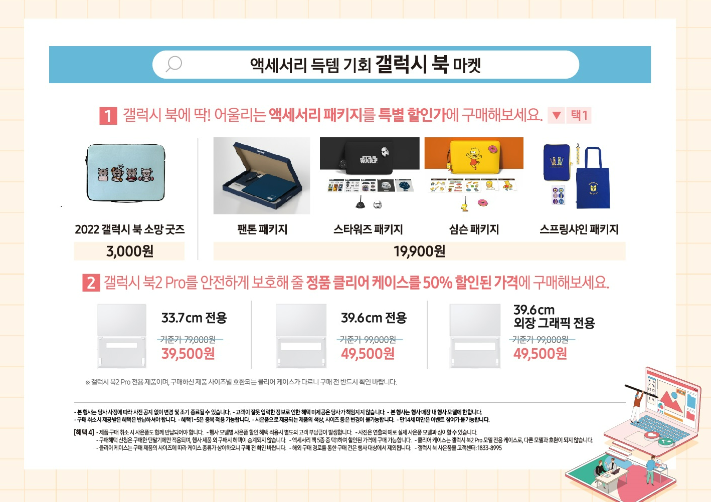 ▼갤럭시 북 해당 모델 구매 시 갤럭시 북 관련 액세서리를 특별 할인된 금액에 구매할 수 있는 혜택을 받아 보실 수 있는데요. 밑에 이미지 내용처럼 2022 갤럭시 북 소망 굿즈(3,000원), 팬톤 패키지, 스타워즈 패키지, 심슨 패키지, 스프링 샤인 패키지(19,900원)중 하나를 선택해 구매할 수 있다고 합니다.