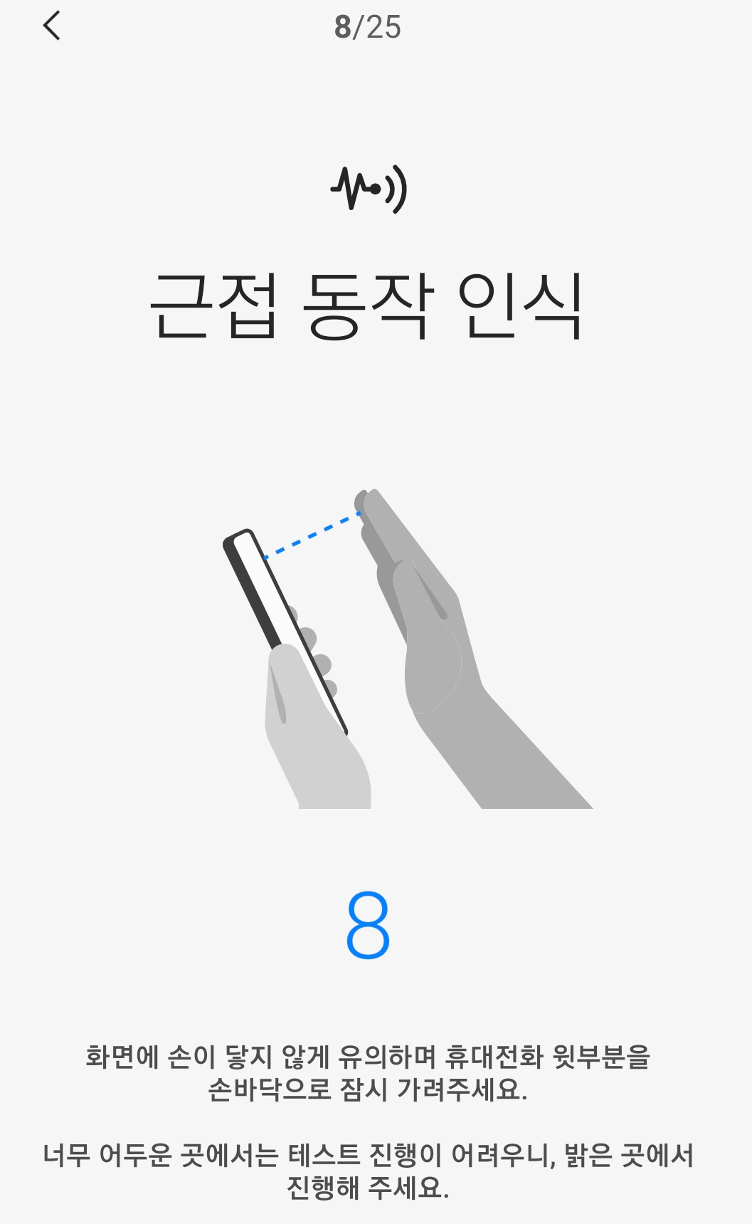 그 이후부터 직접 스마트폰이 하라는 데로 따라 해줘야 합니다. 근접 동작 인식은 손바닥이 스마트폰 화면에 닿지 않게 10초 동안 화면을 가려주기만 하면 됩니다.
