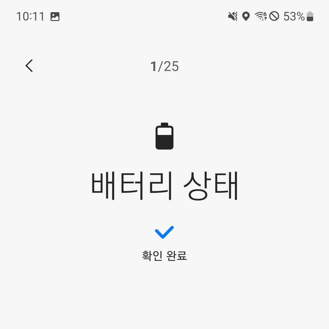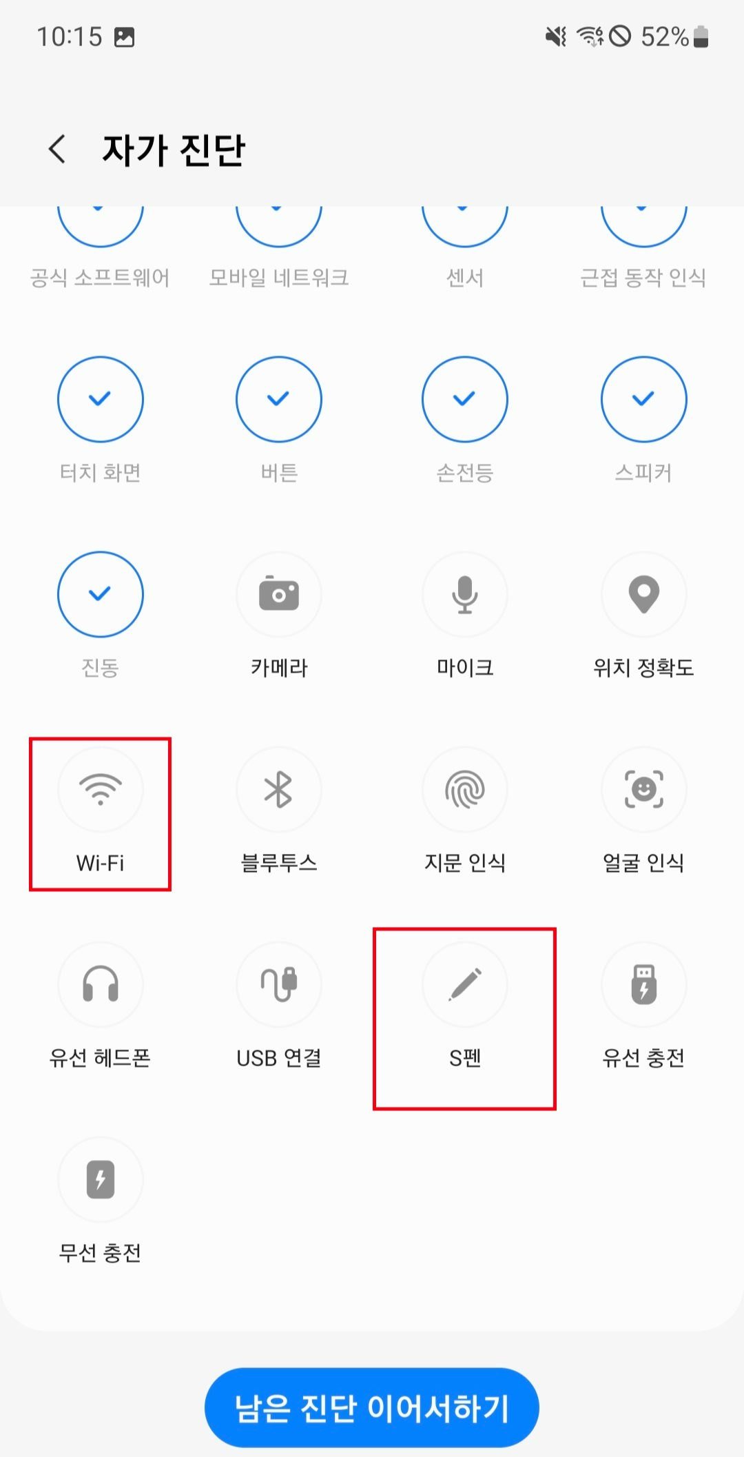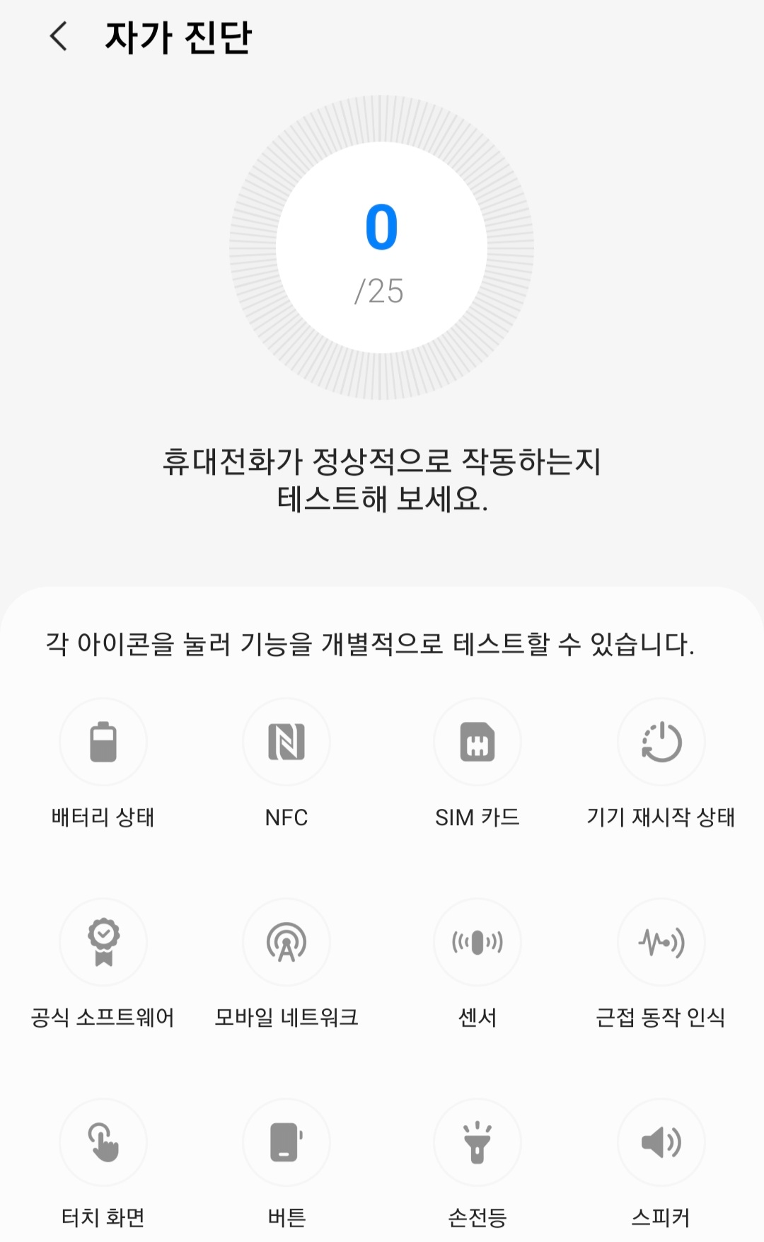 현재 사용 중인 스마트폰 진단 개수는 25개였는데 생각보다 너무 많아서 중간에 중지를 했습니다. 저처럼 굳이 전체다 점검을 할 필요 없고 사용 중인 기능 중 잘 안 되는 것만 클릭해서 한 품목씩 자가진단을 할 수도 있습니다. 예를 들어 스마트폰 "Wi-Fi"기능에 이상이 있는 거 같다면 "Wi-Fi"만 클릭해주면 되고 혹은 "S펜"에 문제가 생긴 거 같다면 "S펜"만 클릭해서 자가진단을 하면 됩니다.