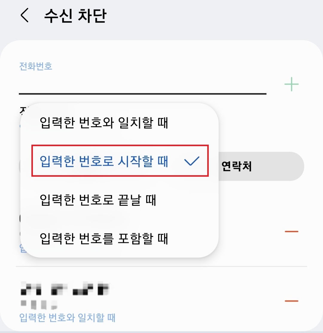 수신 차단 기본 설정으로 적용 기준란을 보면 "입력한 번호와 일치할 때"라고 되어있을 겁니다. 그걸 클릭해주면 그 외 "입력한 번호로 시작할 때", "입력한 번호로 끝날 때", "입력한 번호를 포함할 때" 총 3가지를 더 설정할 수가 있습니다.
