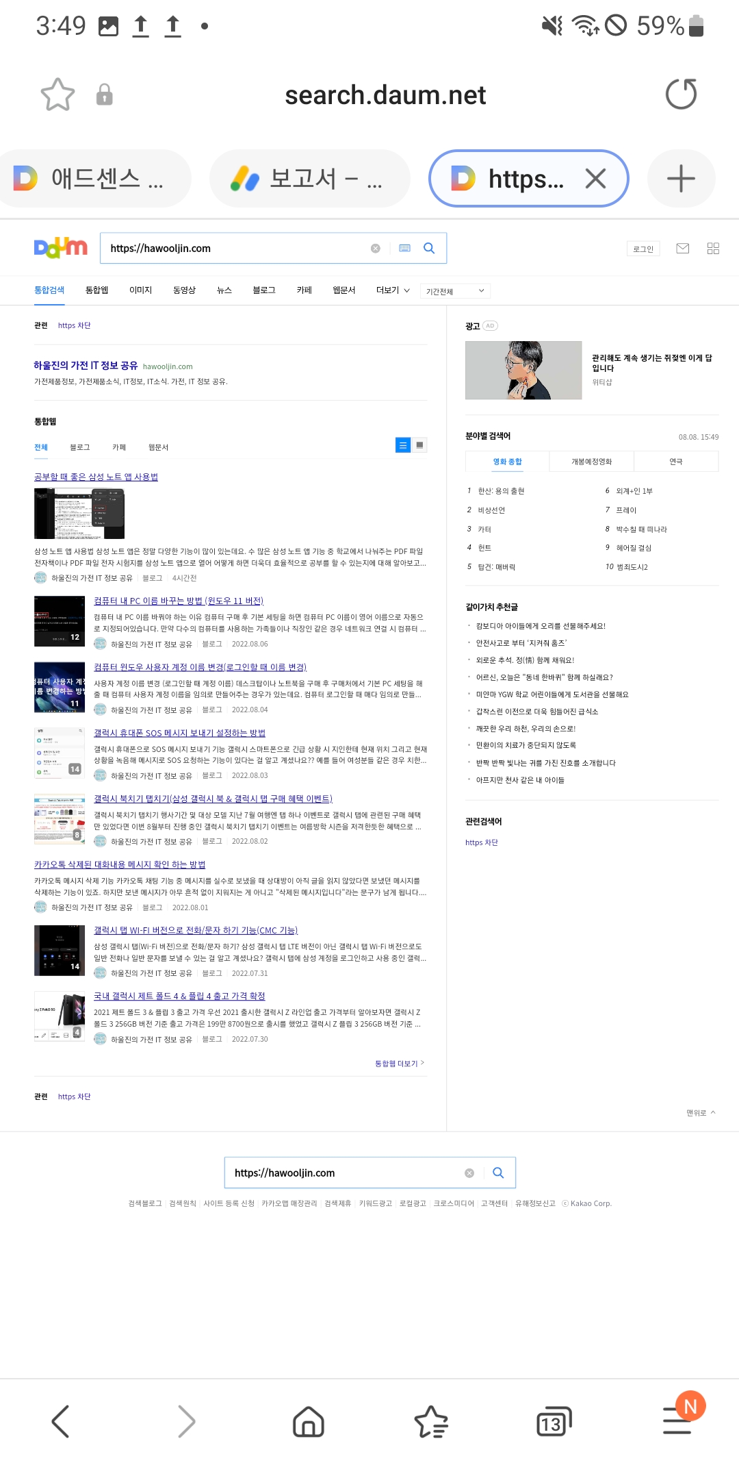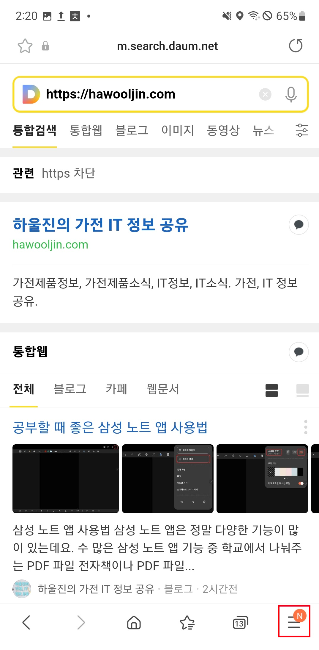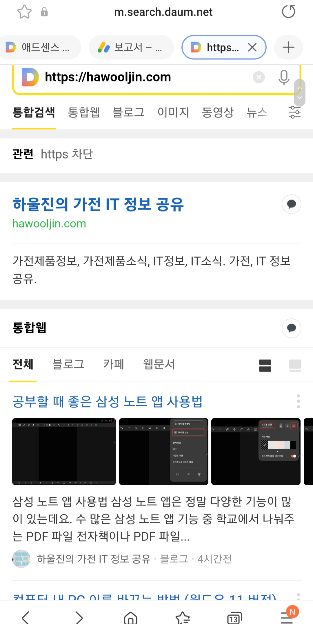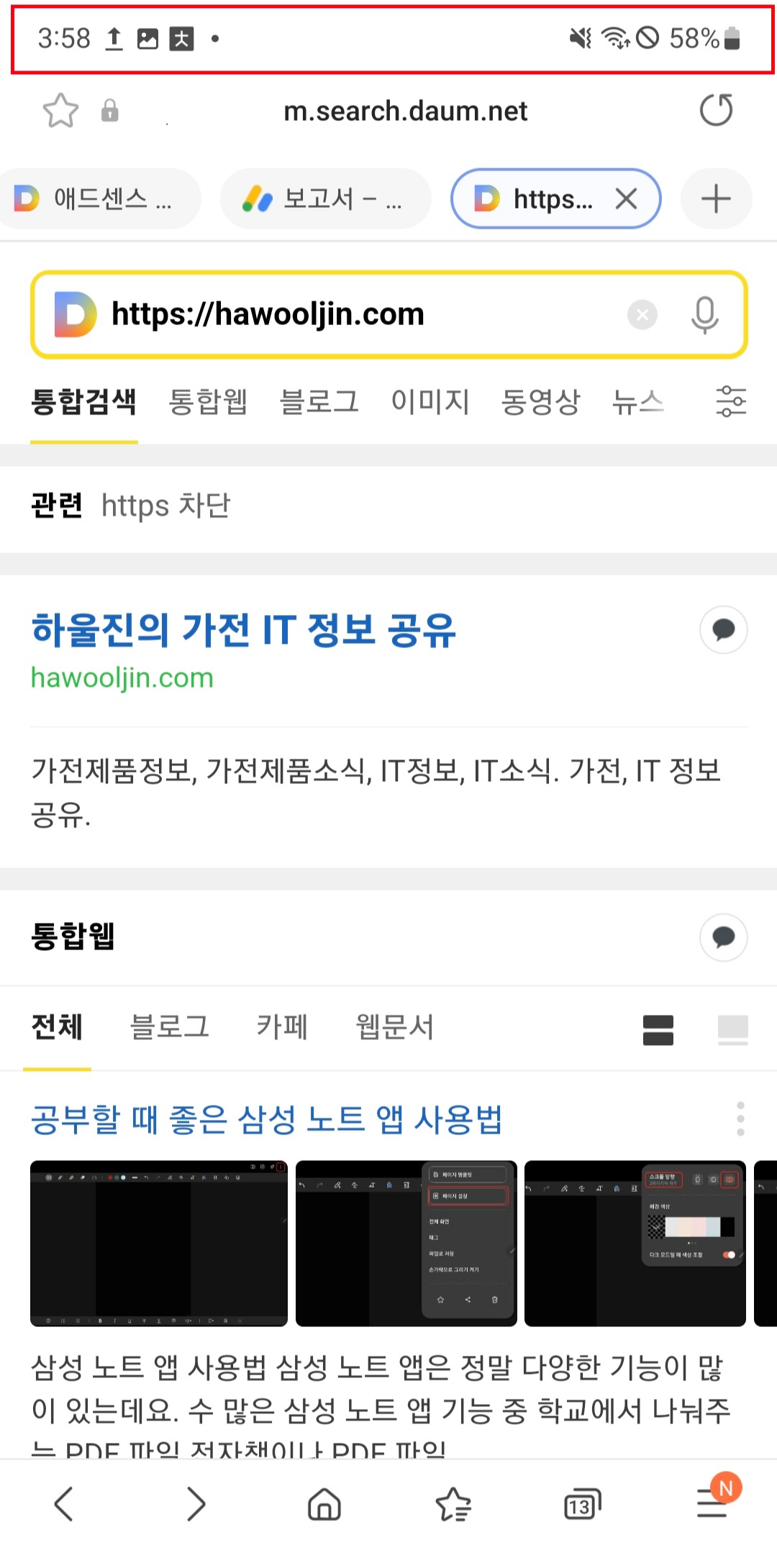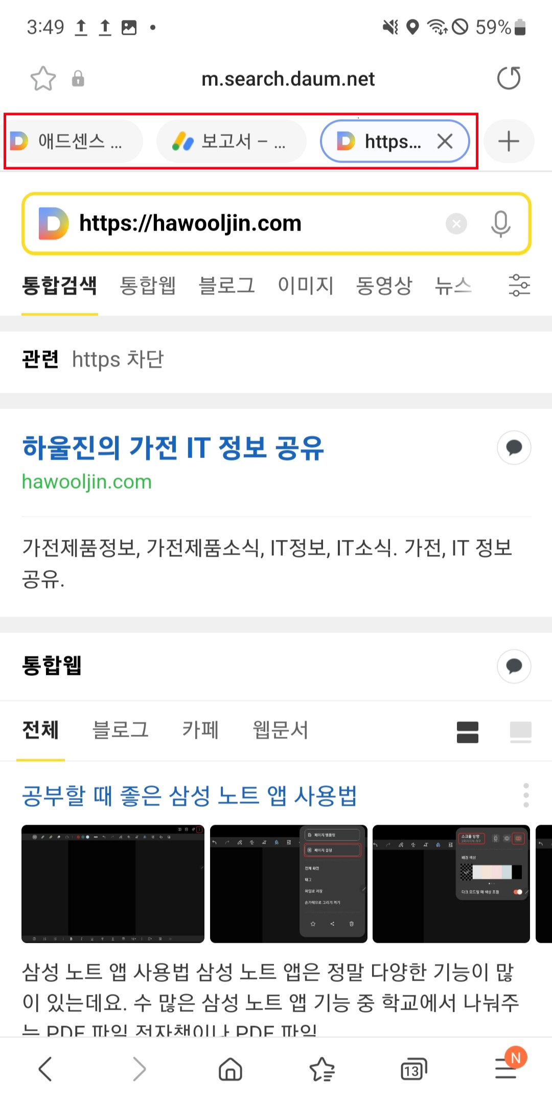▼그럼 삼성 인터넷 주소창 밑에 탭 표시가 생기면서 컴퓨터 인터넷처럼 다양한 사이트에서 검색을 할 수가 있습니다. 그럼 스마트폰으로 인터넷 쇼핑을 할 때 가격 비교하기도 편리하고 다양한 인터넷 사이트에 있는 정보를 수집할 때도 편리하게 사용할 수 있습니다.