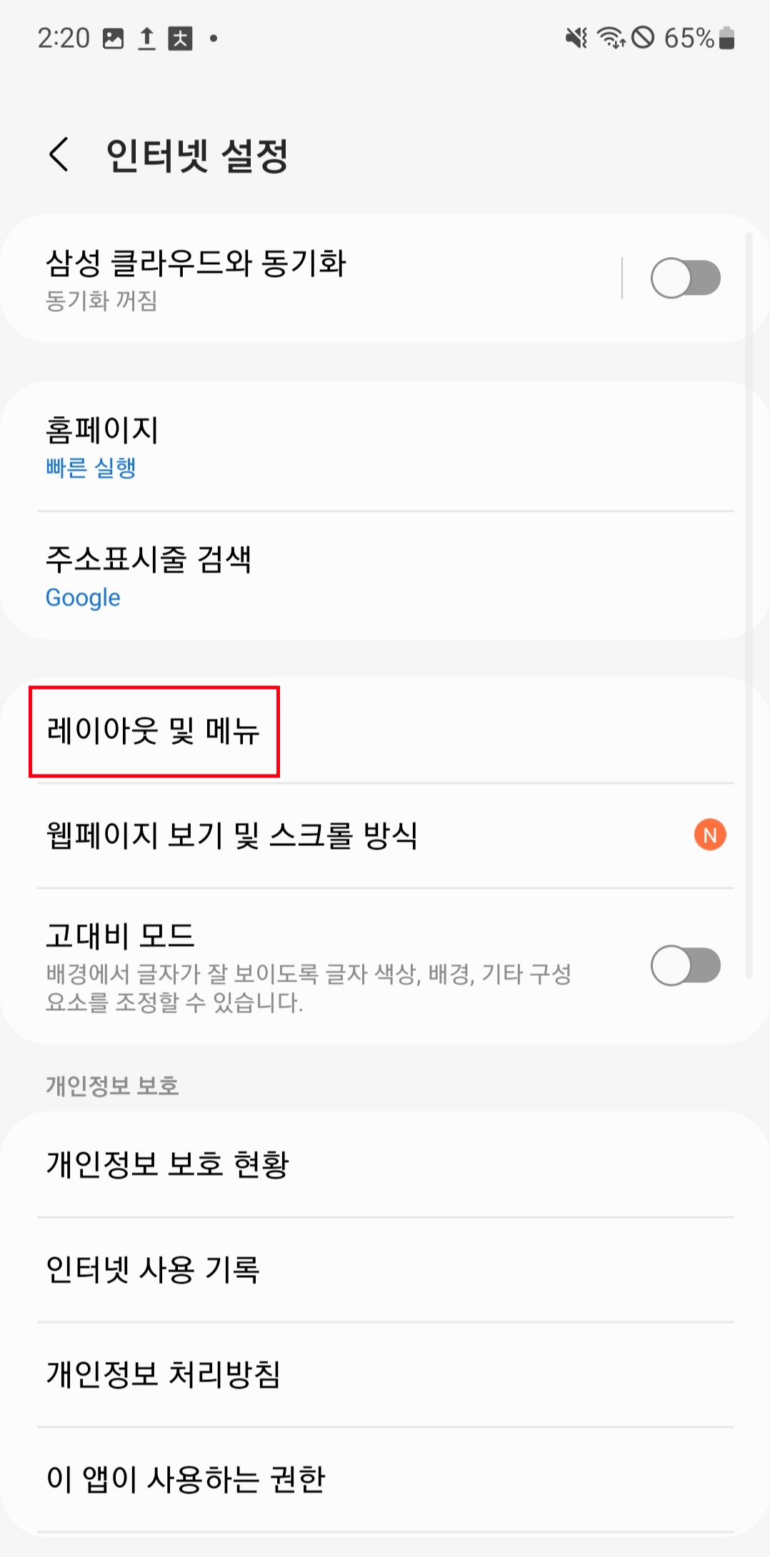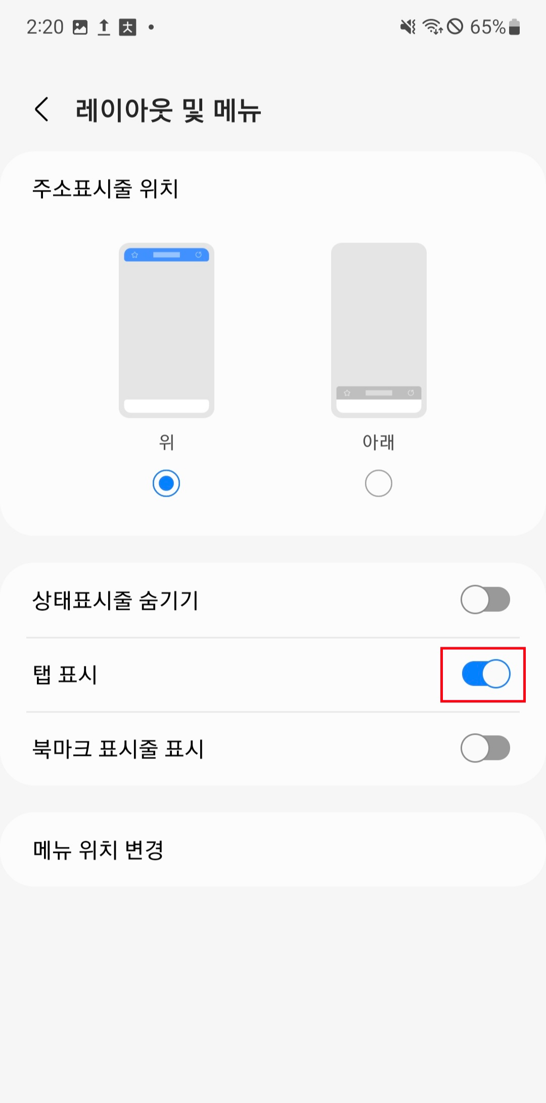 ▼다음은 상태 표시줄 숨기기 설정을 해보겠습니다. 설정 방법은 탭 표시 설정할 때랑 동일하게 삼성 인터넷을 실행 후 [더보기(三) 모양]을 클릭 한 다음 [레이아웃 및 메뉴]에서 상태 표시줄 숨기기를 활성화시켜줍니다.
