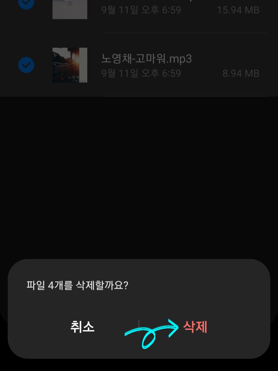 ▼그럼 갤럭시 워치에 저장되어 있는 음악 목록들이 나열되어 있을겁니다. 그중 삭제하고 싶은 음악을 체크한 다음 삭제해주면 갤럭시 워치에 저장되어 있는 음악 목록들이 깔끔하게 삭제됩니다.