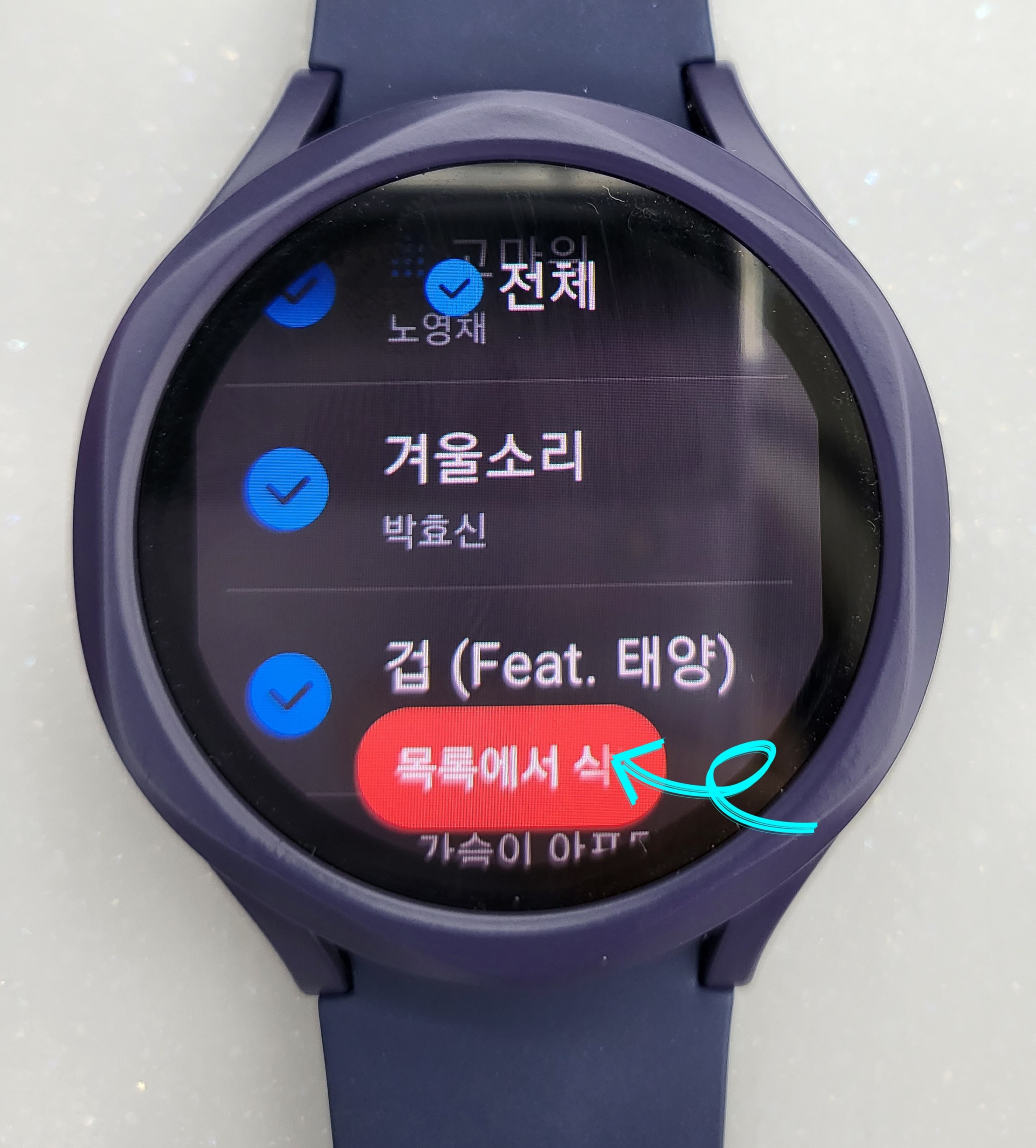 ▼그럼 선택한 음악이 체크되면서 [목록에서 삭제]라는 문구가 뜰겁니다. 그걸 클릭해 삭제하고 싶었던 음악을 삭제해주면 됩니다. 만약 갤럭시 워치에 저장되어 있는 음악을 전체 삭제하고 싶다면 전체를 클릭 후 목록에서 삭제를 클릭해주면 됩니다.