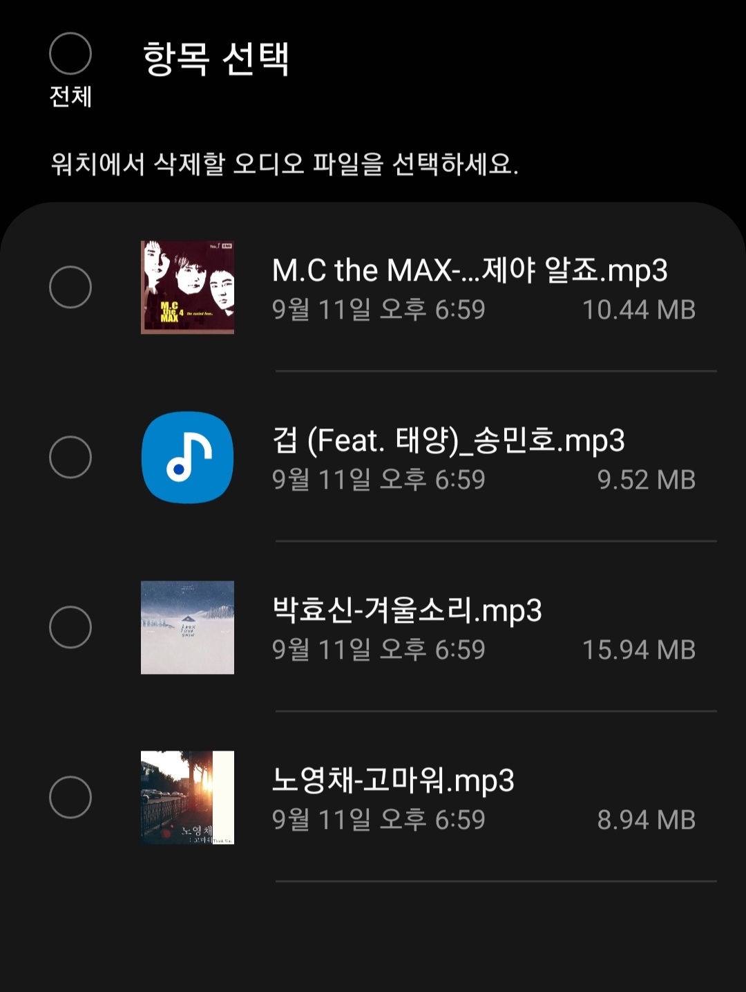 ▼그럼 갤럭시 워치에 저장되어 있는 음악 목록들이 나열되어 있을겁니다. 그중 삭제하고 싶은 음악을 체크한 다음 삭제해주면 갤럭시 워치에 저장되어 있는 음악 목록들이 깔끔하게 삭제됩니다.