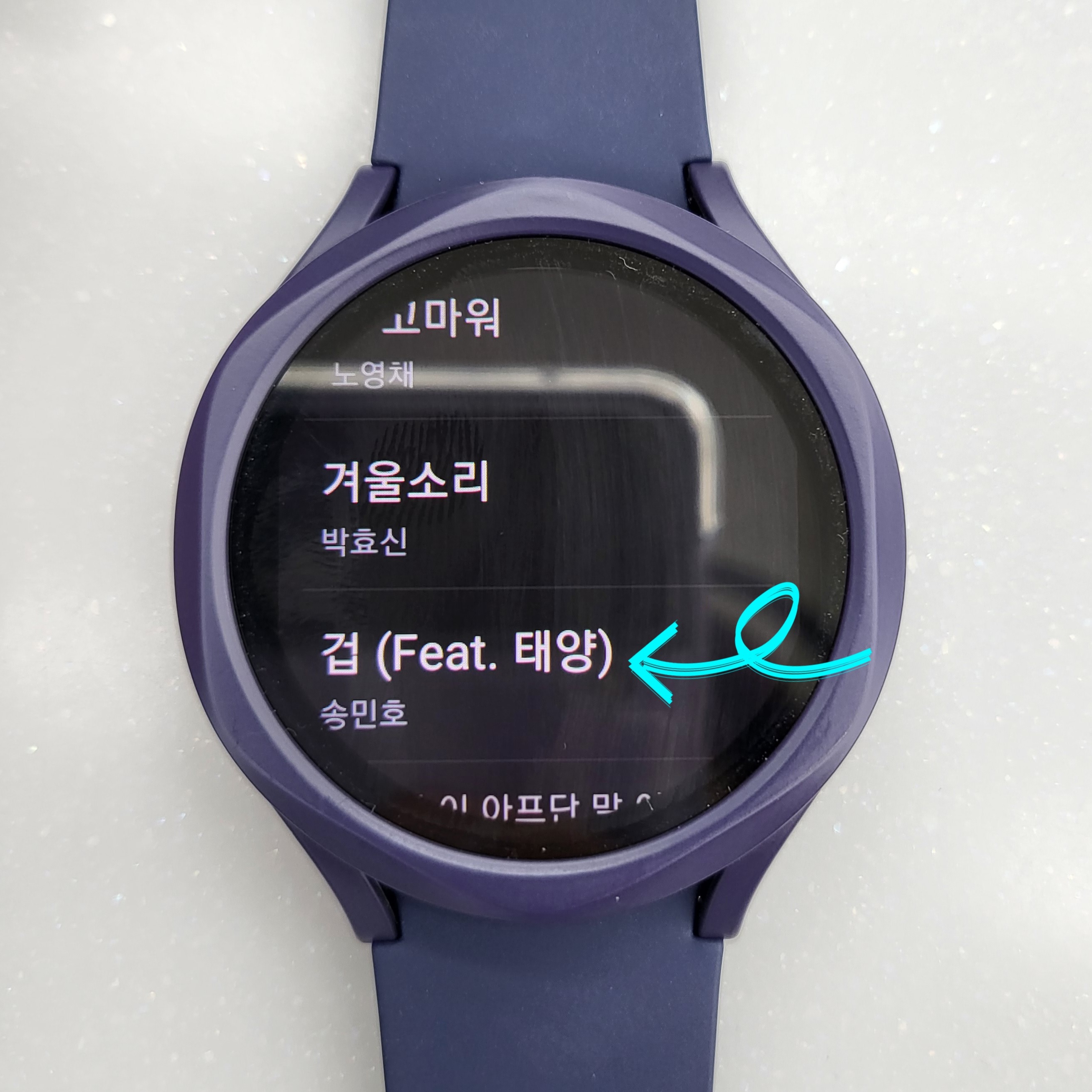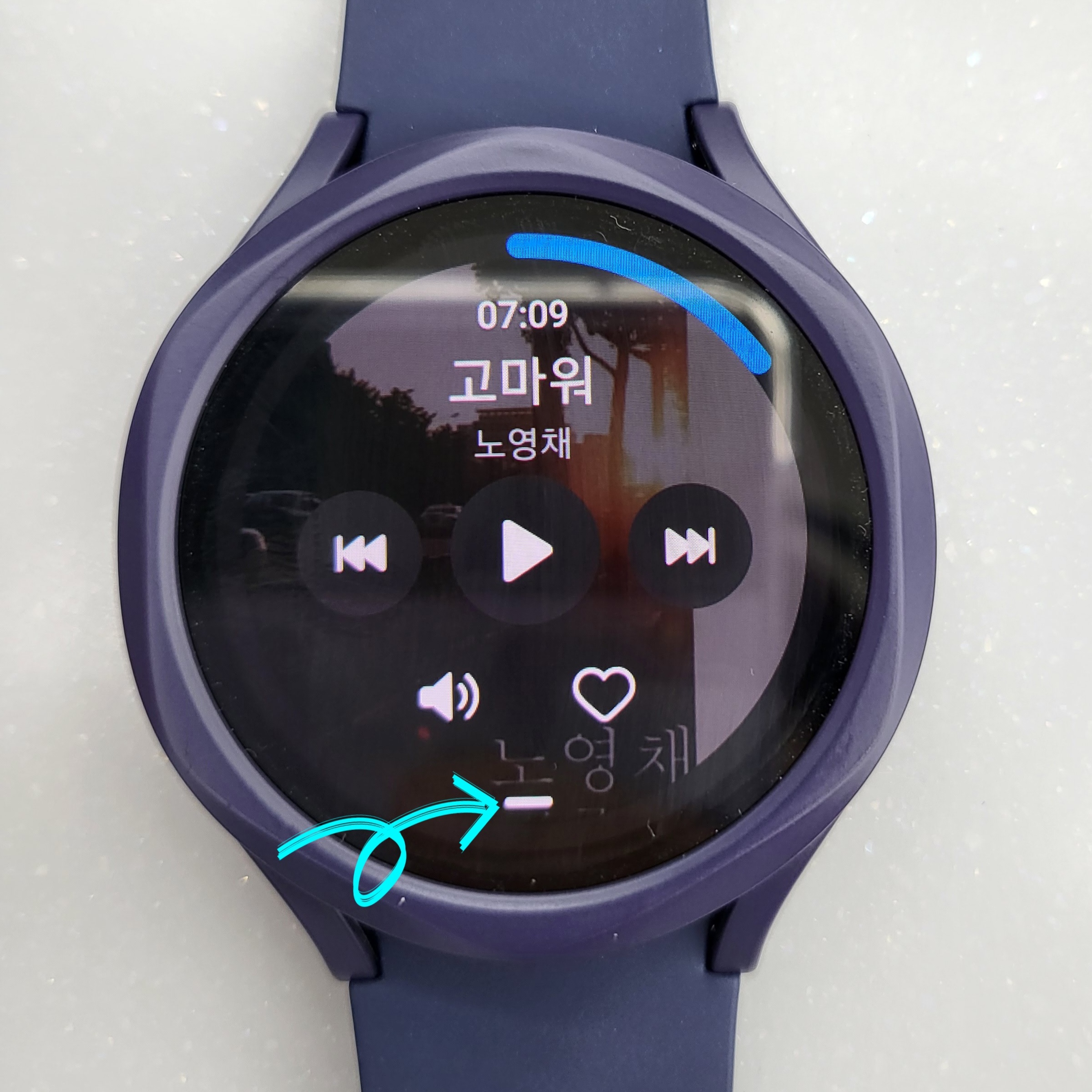 ▼그다음 갤럭시 워치 화면 아래쪽을 보면 조그마한 흰색선이 있는데 그걸 손가락으로 위로 올려주세요. 그럼 갤럭시 워치에 저장되어있는 음악 목록들이 있을 겁니다. 그중 삭제하고 싶은 음악을 손가락으로 약 3초간 꾹 눌러주세요.