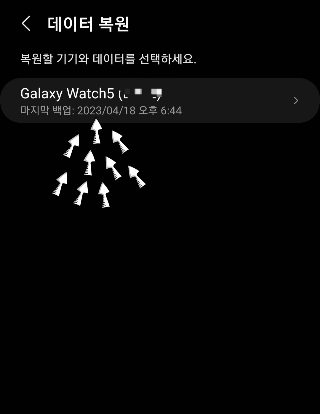 ▼그다음 [폰에서 보기]를 클릭하고 새 핸드폰 전원을 켜면 갤럭시 워치 데이터 복원 화면으로 넘어가지고 [해당 갤럭시 워치를 클릭] 해 줍니다.