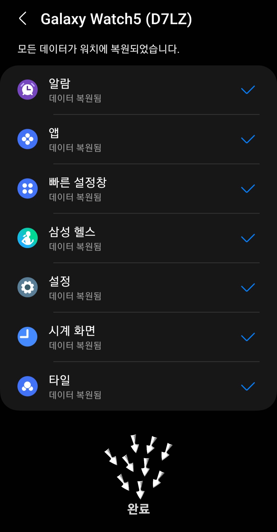 ▼복원이 완료되었다면 [완료]를 클릭한 후 갤럭시 워치를 다시 확인하면 백업해 놓았던 그대로 새 핸드폰이랑 연결해서 사용할 수 있습니다.