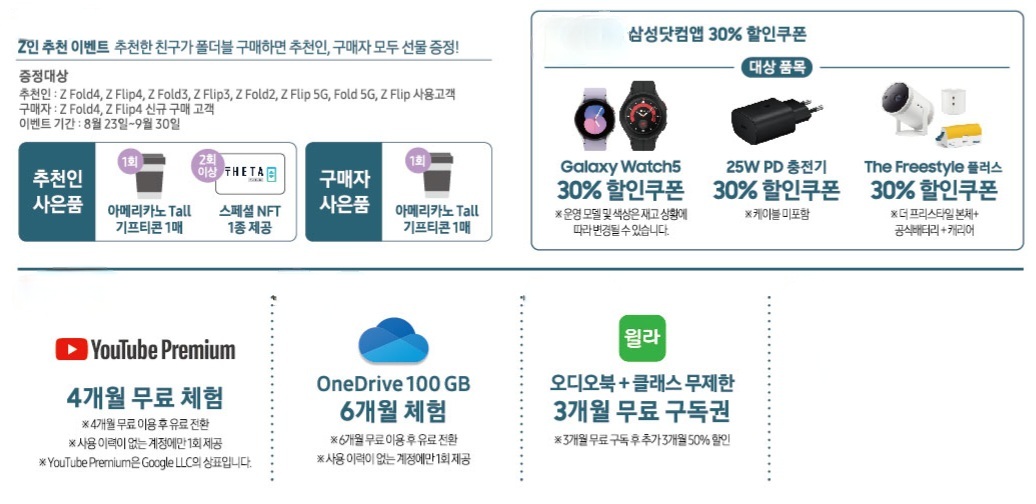 그 외 사전 구매 혜택이랑 동일하게 Z인 추천 이벤트, 삼성닷컴 앱 30% 할인쿠폰( 워치5, 25W PD 충전기, 더 프리스타일), 유튜브, 원드라이브, 윌라 구독권 및 체험권 개월 수도 동일합니다.