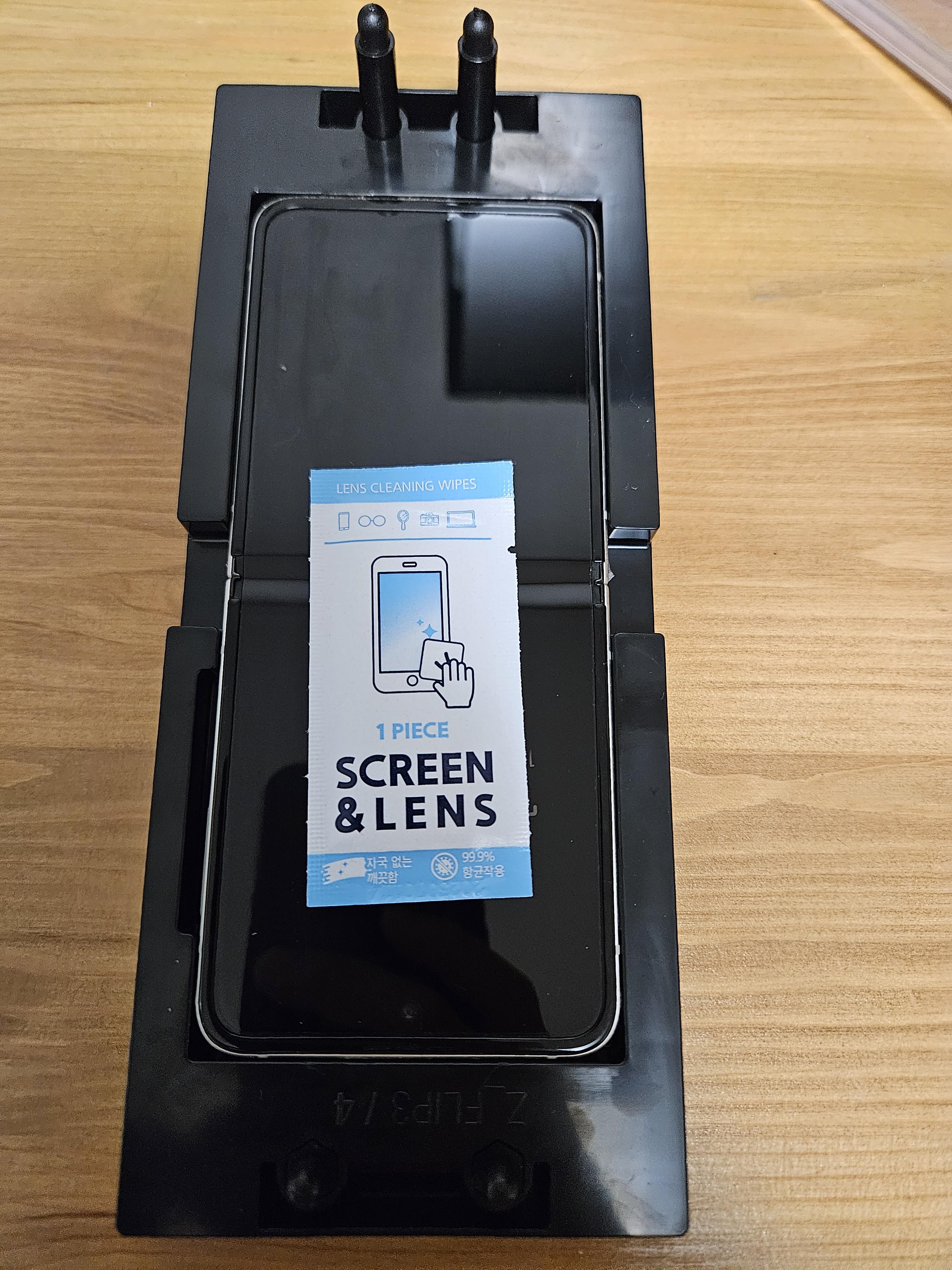 ▼기존 필름을 제거 후 박스에 들어있던 클린 티슈로 제트플립3 화면을 깨끗하게 닦은 후 먼지 제거 스티커를 이용해 화면에 묻은 먼지까지 깨끗하게 제거를 해주면 보호필름 붙일 준비 끝!!