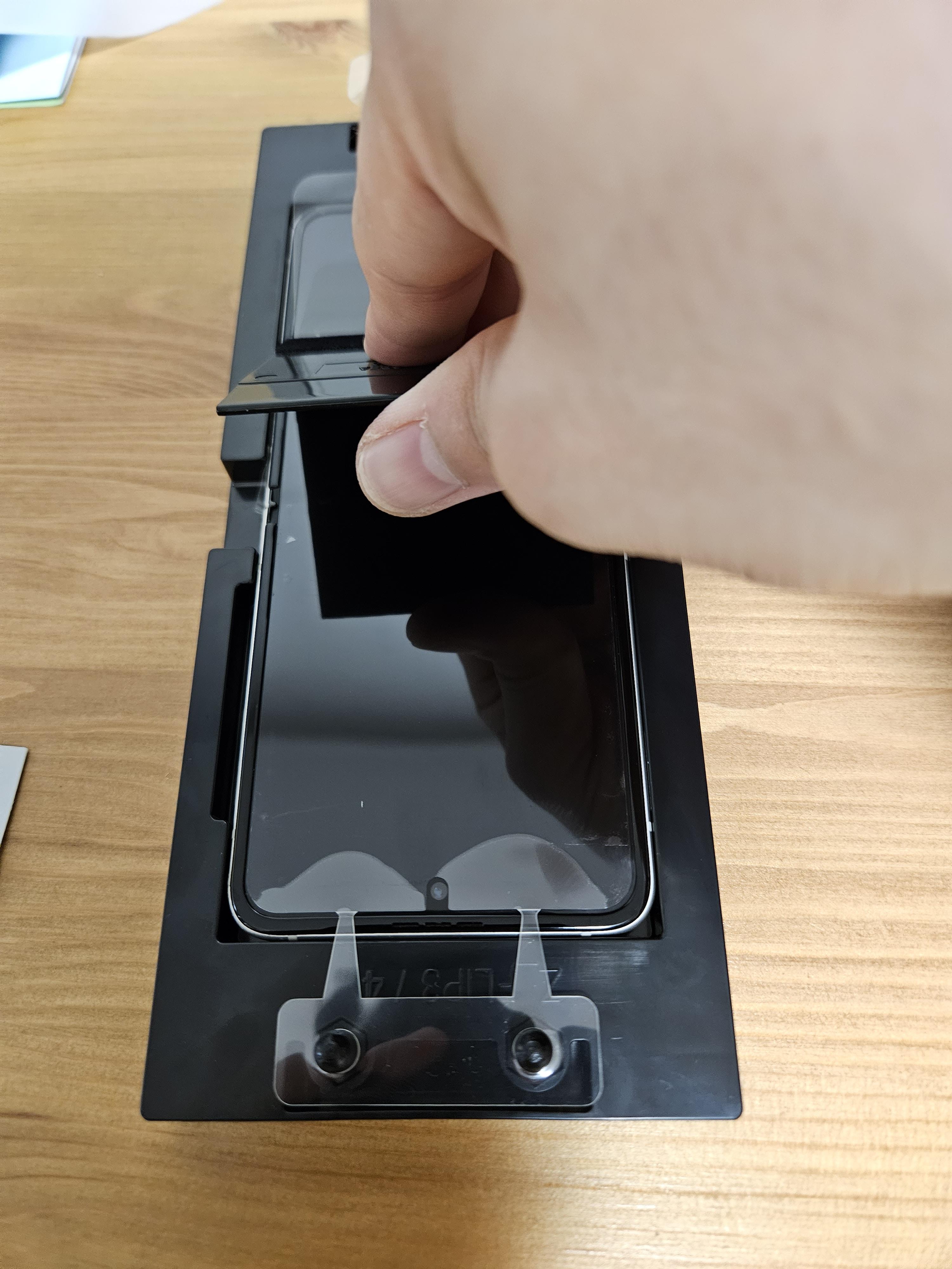 ▼이제 본격적으로 필름부착에 도전해 보았는데요. 우선 지그받침대 뒷면에 위아래 테이프를 떼고 바닥에 고정을 시켜야 하더라고요.