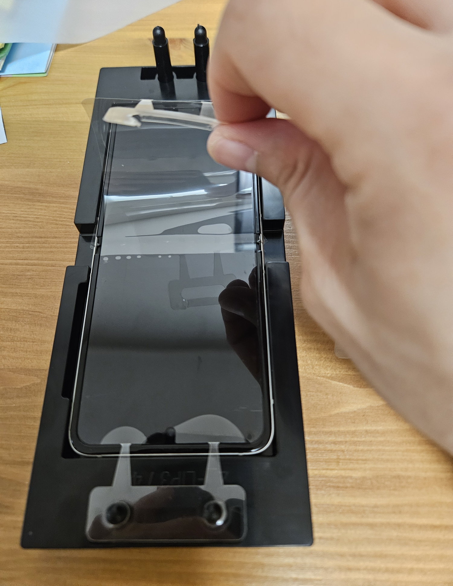 ▼그다음 고정된 필름을 밀대로 아래에서 위로 살살 밀어주면 되는데요. 쭉 밀대로 필름을 아래에서 위로 밀면 긴 구멍 필름 부분이 찢어지면서 화면에 부착이 되고 기포 있는 부분을 다시 밀대로 살살 밀어 기포를 제거 후 부착된 이형필름을 제거해 주면 되더라고요.
