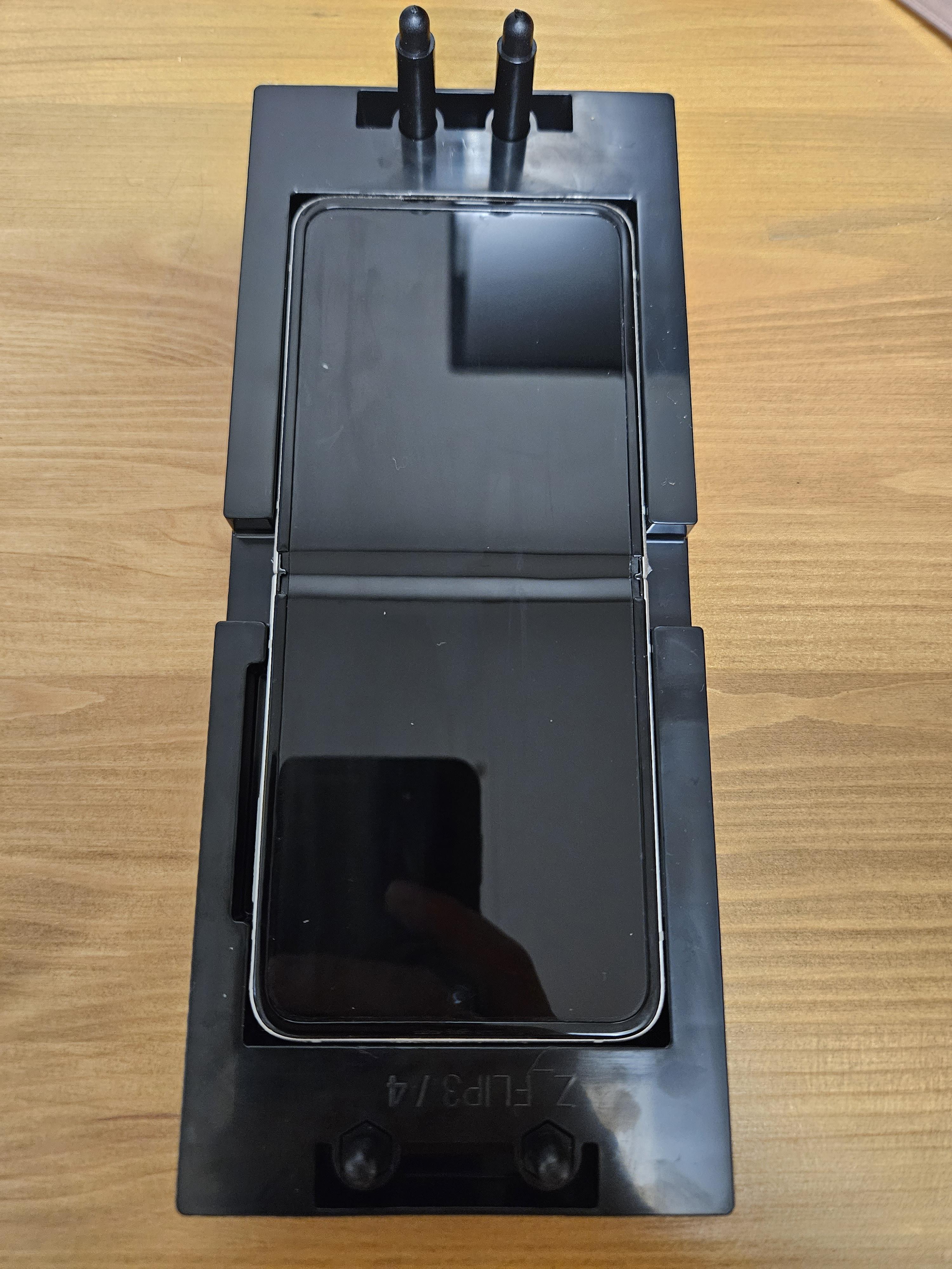 ▼밑에 이미지 화면처럼 바닥에 지그받침대를 고정시킨 다음 구멍에 맞춰 짧은 홀더 긴 홀더를 삽입 후 제트플립3를 넣고 저는 기존 보호필름을 제거했습니다.