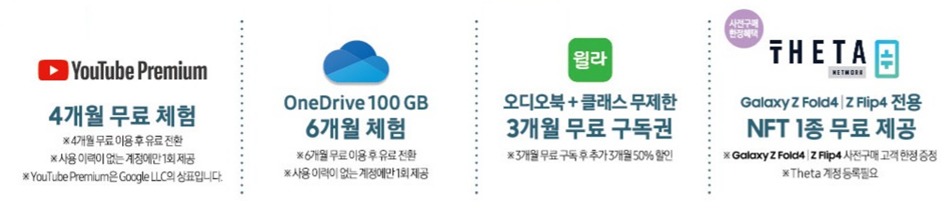 그 외 이번에 새로 나온 갤럭시 워치5 및 25W PD 충전기, 더 프리스타일 플러스 30% 할인쿠폰도 증정되고 유튜브 4개월 무료 체험권, 원드라이브 6개월 체험권, 윌라 오디오북 + 클래스 무제한 3개월 무료 구독권을 증정, 그리고 마지막으로 NFT 1종을 무료로 제공해드린다고 합니다.