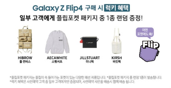 ▼그 외 럭키 혜택으로 갤럭시 제트 플립4 사전 예약한 일부 고객에게 하이브로우 툴 캔버스, 에이카화이트 스웻셔츠, 질스튜어트 미니백, 키르시 버킷백 중 1종을 랜덤으로 증정해드린다고 합니다. 럭키 혜택은 사전 예약자 모두한테 드리는 혜택이 아닌 일부 고객에게만 증정된다고 하니 이 점 참고해주세요.