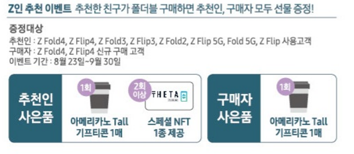 Z인 추천 이벤트로 현재 폴더블 사용자가 지인한테 갤럭시 제트 폴드4 혹은 플립4를 추천해 구매 시 추천인, 구매자한테 아메리카노 Tall 기프티콘 1매를 증정하는 이벤트를 한다고 합니다. Z인 추천 이벤트 기간은 8월 23일부터 9월30일까지 진행한다고 합니다.