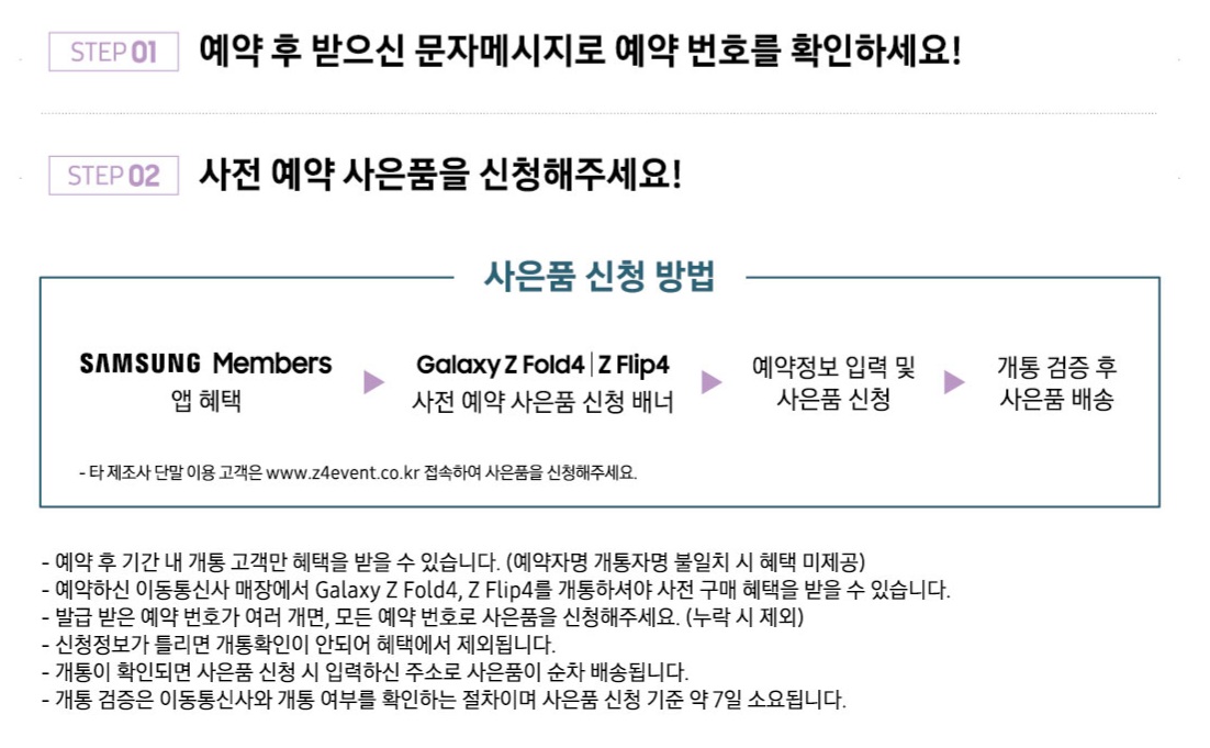 갤럭시 제트 플립4 사전 예약자한테 문자메시지로 예약 번호를 별도로 보내드리고, 사전 예약 사은품 신청 방법은 Samsung Members 앱 혜택 ▶ 갤럭시 제트 폴드4 l 플립4 사전 예약 사은품 신청 배너 클릭 ▶ 예약정보 입력 및 사은품 신청후 ▶ 사은품 배송이 진행됩니다.