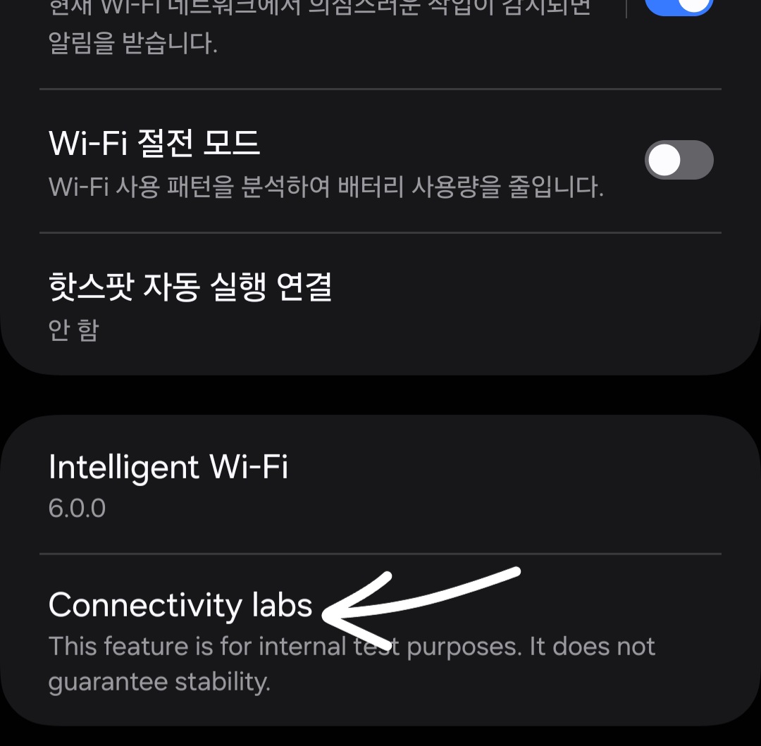▼그럼 Intelligent Wi-Fi 설정란으로 넘어가지는데요. Intelligent Wi-Fi 설정란에서 아래로 쭉 스크롤을 내리다 보면 또 다른 [Intellgent Wi-Fi] 버튼이 있습니다. Intellgent Wi-Fi 버튼을 10번 정도 빠르게 클릭하면 바로 아래에 [Connectivity labs]라는 설정이 생길 겁니다. 그걸 클릭해 주세요.