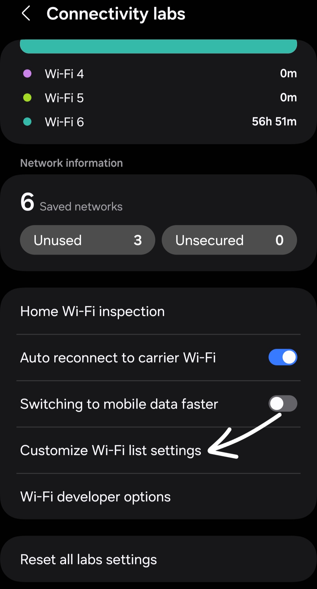 ▼그럼 Intelligent Wi-Fi 설정란으로 넘어가지는데요. Intelligent Wi-Fi 설정란에서 아래로 쭉 스크롤을 내리다 보면 또 다른 [Intellgent Wi-Fi] 버튼이 있습니다. Intellgent Wi-Fi 버튼을 10번 정도 빠르게 클릭하면 바로 아래에 [Connectivity labs]라는 설정이 생길 겁니다. 그걸 클릭해 주세요.