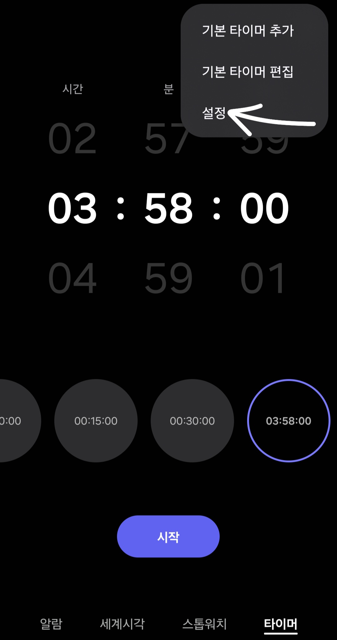 ▼만약 타이머 알람소리가 벨소리로 되어있는 경우 진동으로 변경할 수도 있습니다. [더 보기(•••)]를 클릭 후 [설정] 란으로 들어가 줍니다.