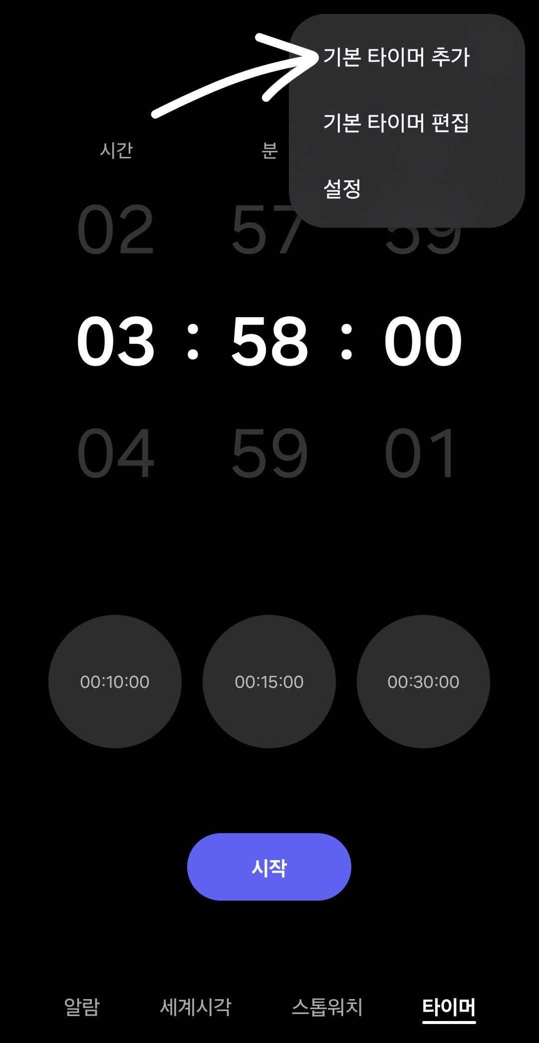 ▼그 외 자주 사용하는 타이머 시간대를 밑에 있는 이미지처럼 추가할 수 있는데요. 타이머 화면에서 [더 보기(•••)]를 클릭 후 [기본 타이머 추가]를 선택해 주면 됩니다.