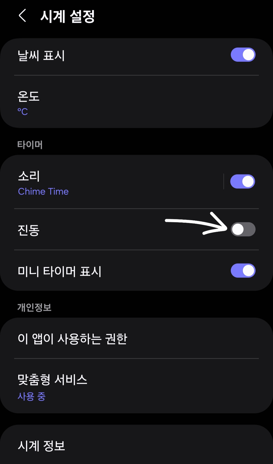 ▼그다음 설정란에서 스크롤을 내리다 보면 타이머 설정란이 보일 겁니다. 거기서 벨소리를 끄고 싶다면 비활성화시킨 후 진동을 활성화시켜 주시면 됩니다.