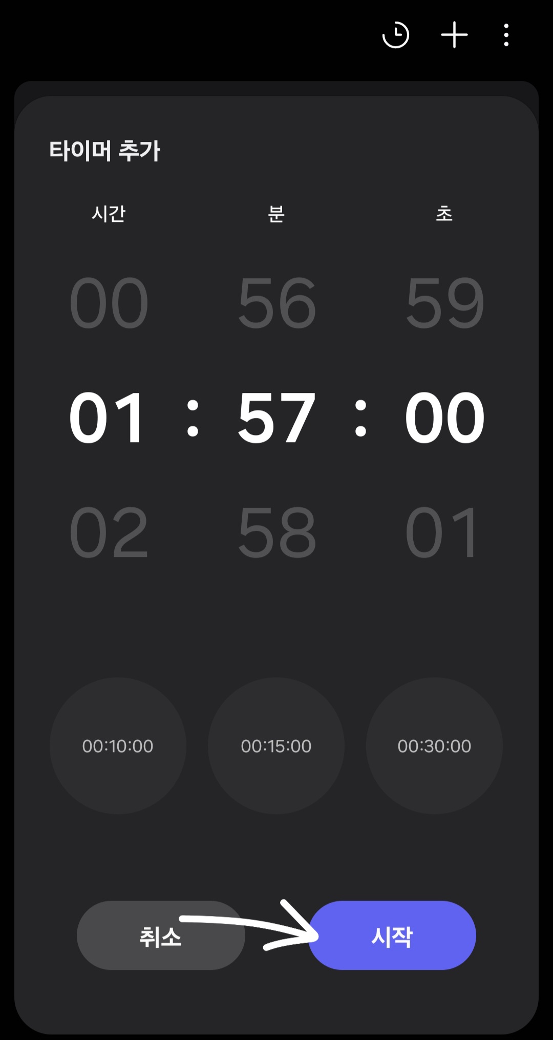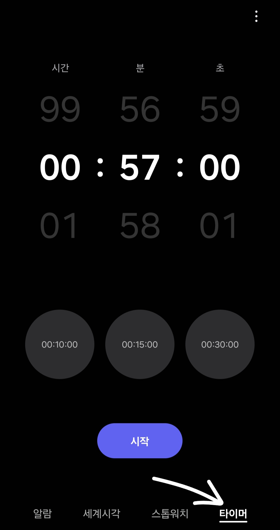 ▼그다음 하단에 있는 [타이머]기능을 선택 후 시간을 지정해 [시작]버튼을 클릭해 줍니다.