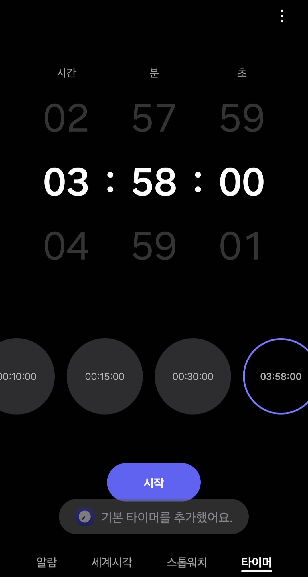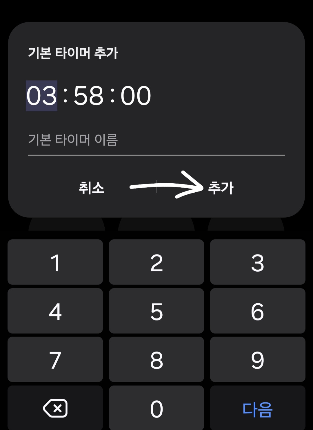 ▼그다음 원하는 타이머 시간대를 지정한 후 [추가] 버튼을 클릭해 주면 타이머 메인 화면에 기본 타이머가 추가됩니다.