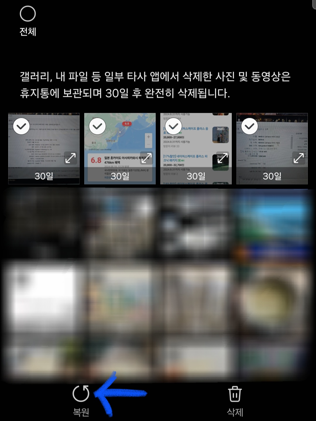 ▼그다음 [휴지통]를 클릭해 주면 기존에 삭제했던 사진들이 보일 겁니다. 그럼 복원하고 싶은 사진을 클릭 후 하단에 [복원] 버튼만 클릭해 주면 삭제했던 사진이 갤러리(사진첩)로 다시 복원됩니다.