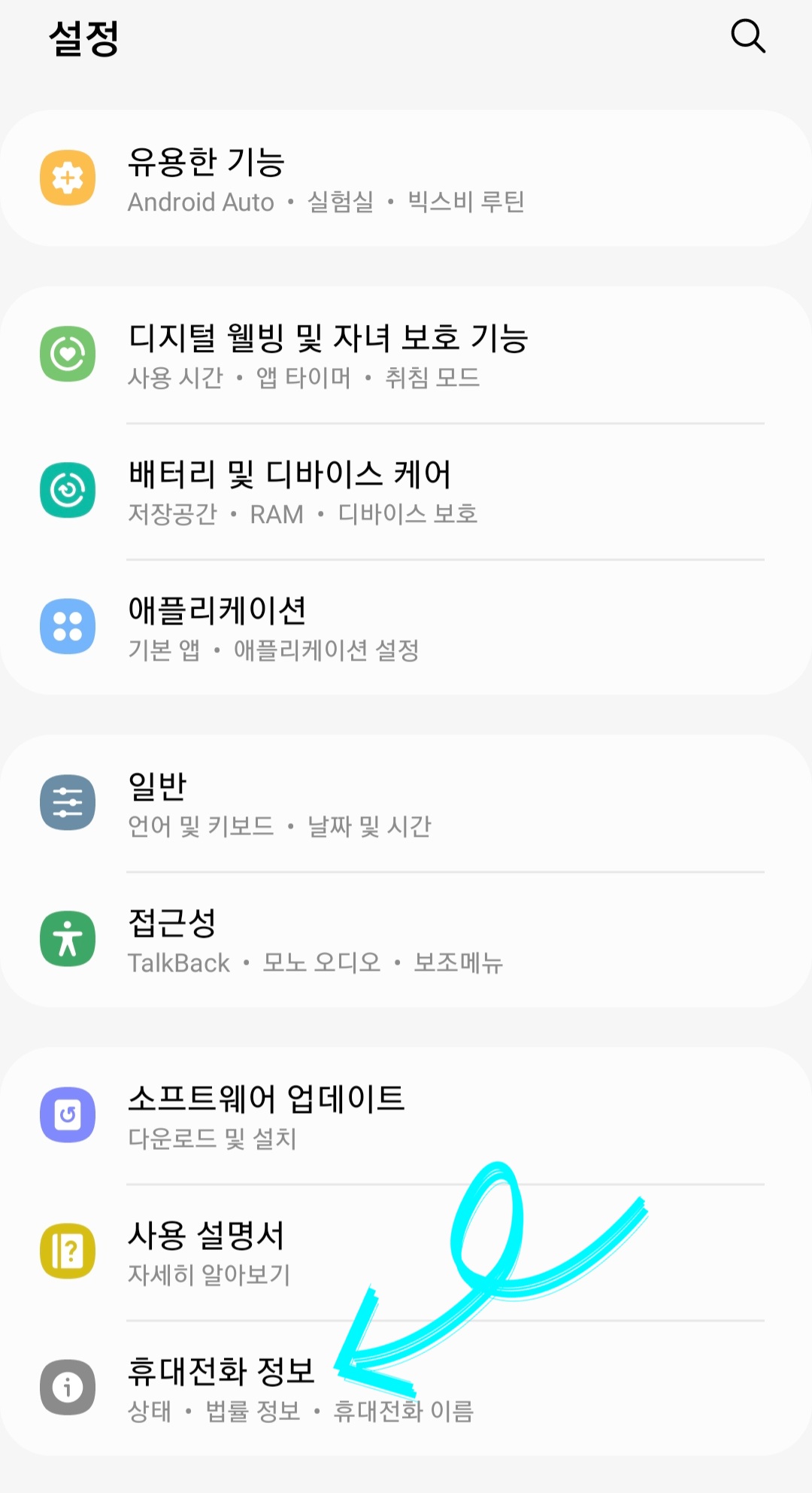 ▼그다음 밑으로 쭉 내려서 제일 하단에 있는 [휴대전화 정보]를 클릭 후 [상태 정보]를 클릭해줍니다