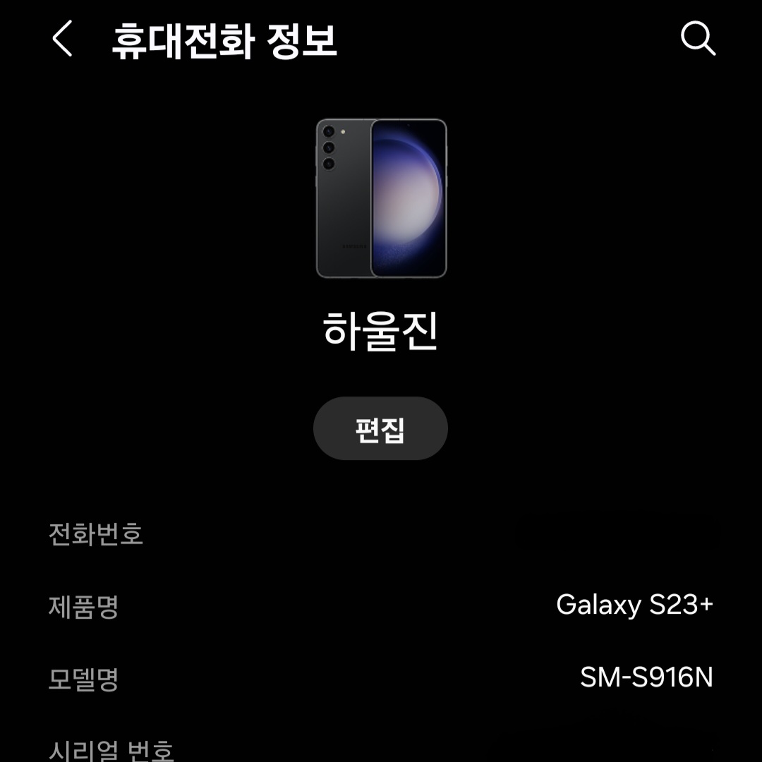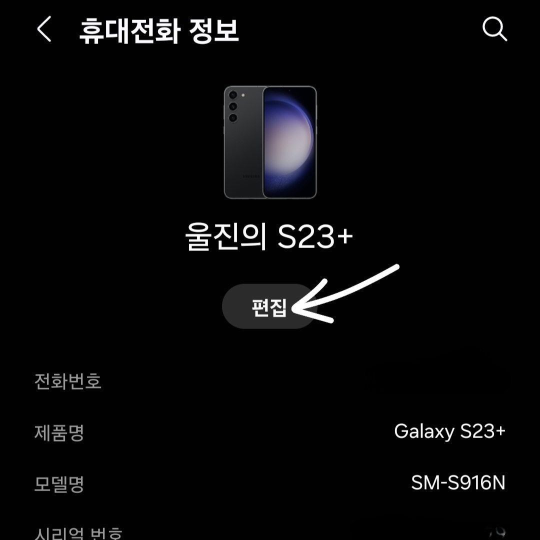 ▼그럼 사용 중인 핸드폰 전화번호 및 제품명, 모델명, 시리얼 번호 등 핸드폰 정보가 쭉 뜨는데요. 그중 상단에 있는 [편집]을 클릭해 주세요.