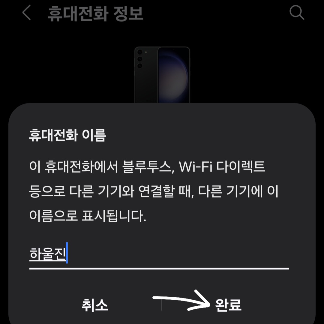 ▼그럼 사용 중인 핸드폰 이름을 원하는 이름으로 변경 후 [완료]만 클릭해 주면 핸드폰 이름이 바뀝니다.