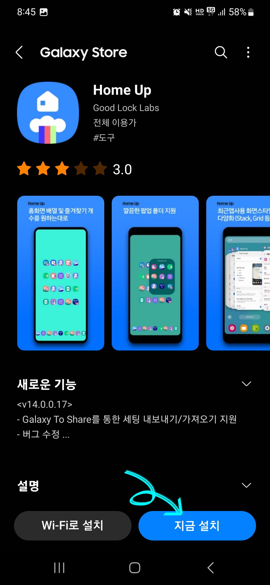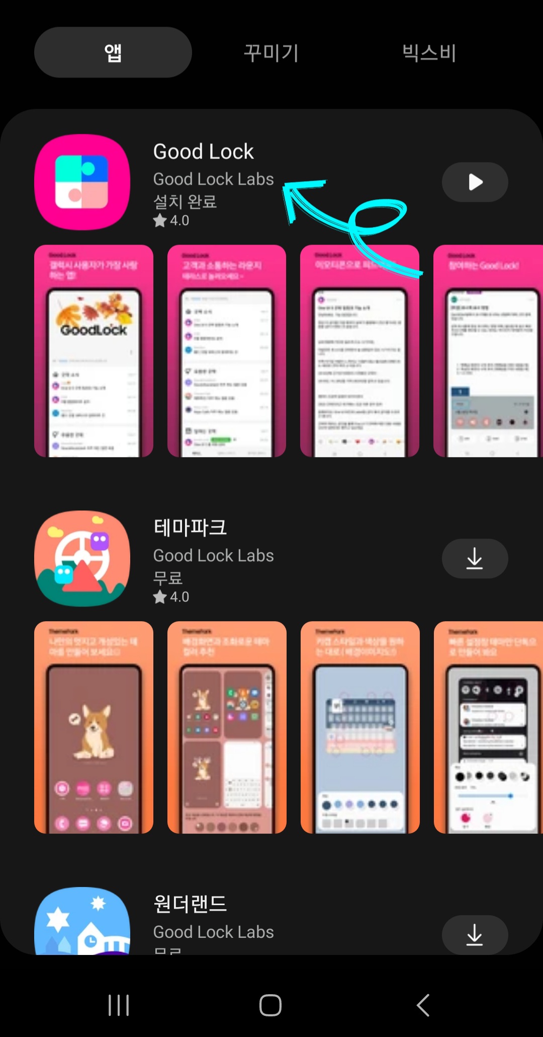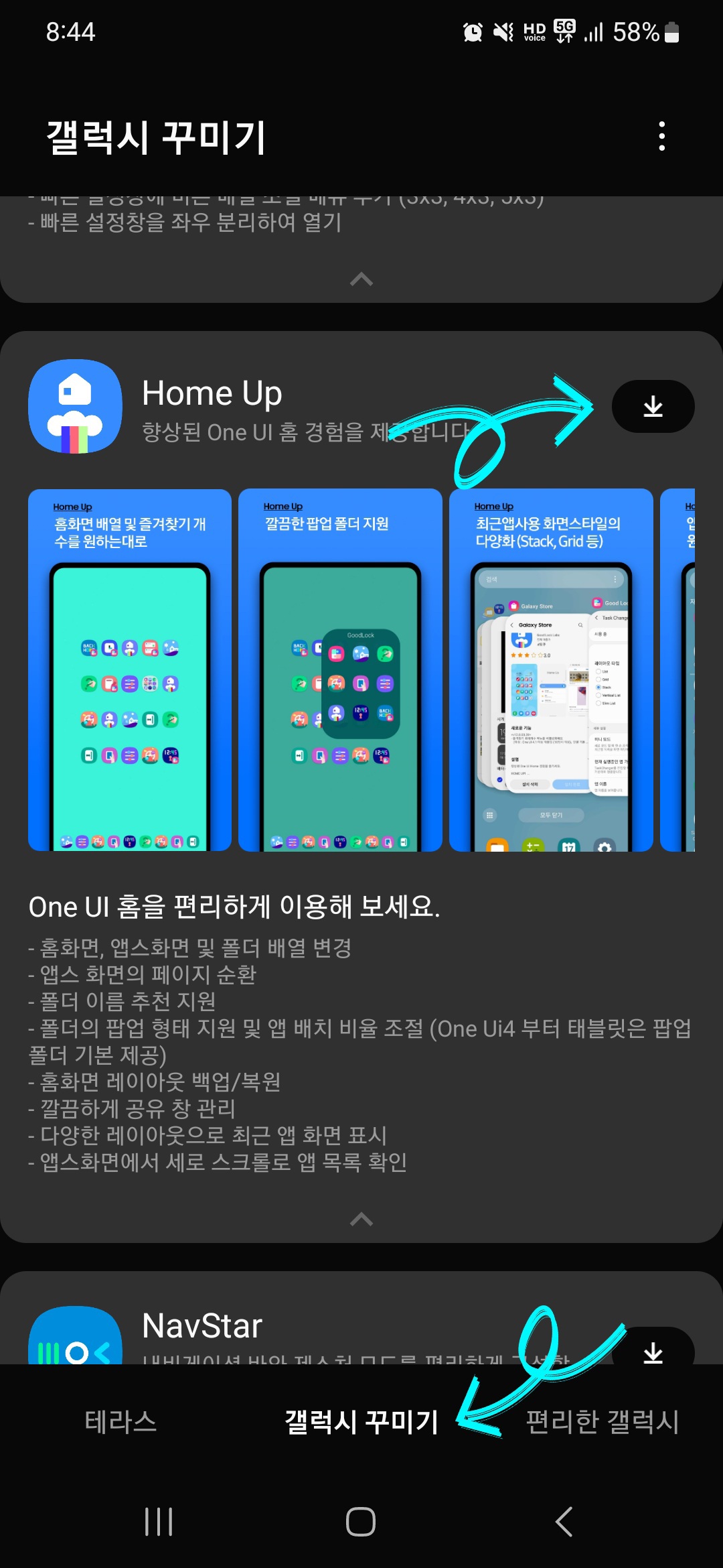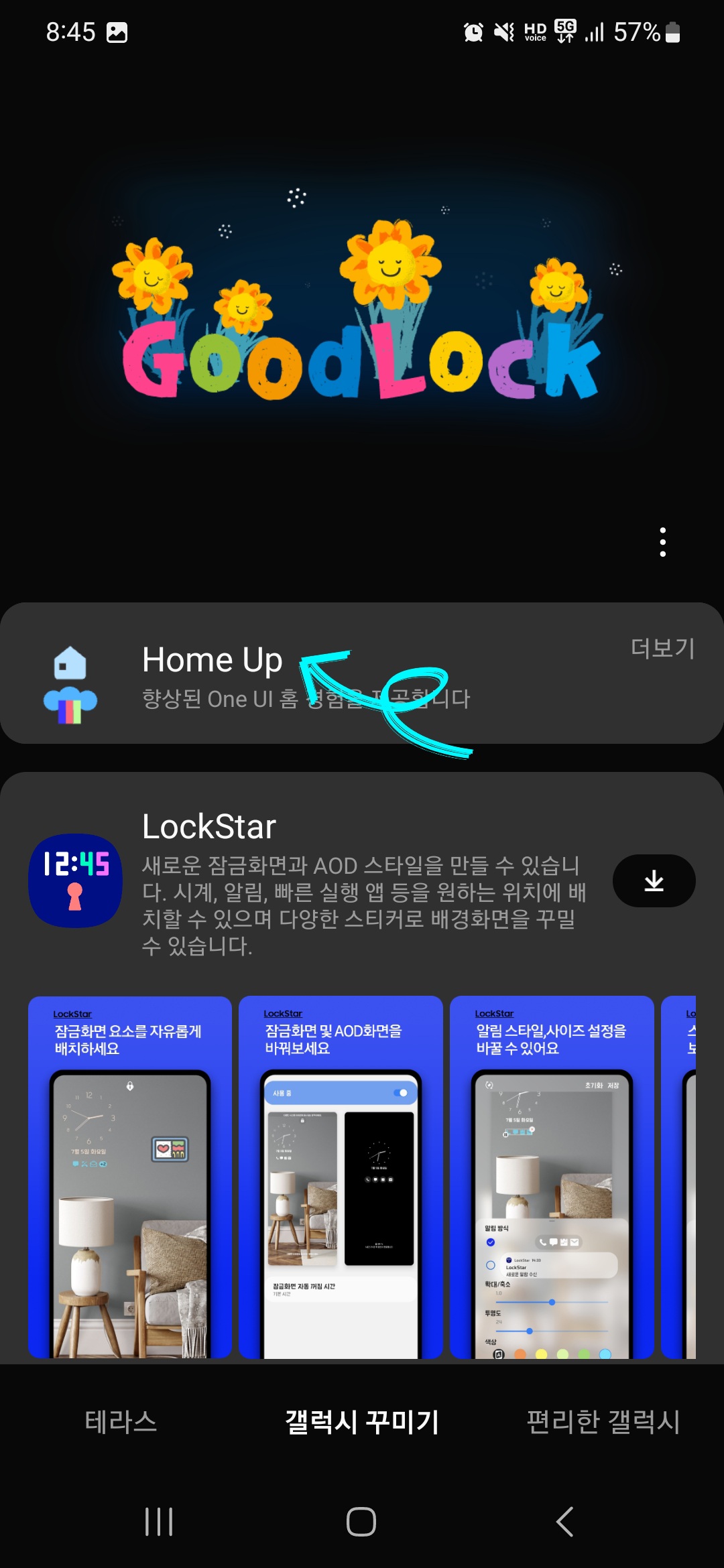 ▼다운로드한 굿락(Good Lock) 어플을 실행 후 하단에 [갤럭시 꾸미기]를 클릭한 다음 [홈 업(Home Up)]을 찾아 다운로드해줍니다.