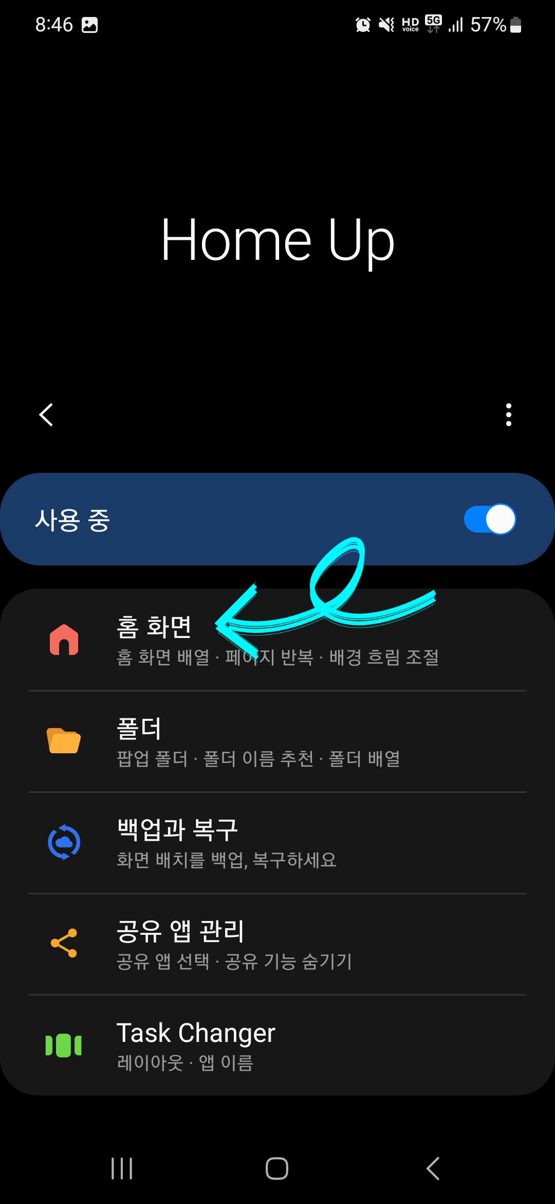 ▼그다음 다시 굿락(Good Lock) 어플을 실행 후 갤럭시 꾸미기를 클릭하면 상단에 다운로드한 홈 업(Home Up) 있을 겁니다. 다운로드한 홈 업(Home Up)을 실행해 간단한 확인절차를 끝내면 밑에 있는 이미지처럼 뜨는데여. 우선 사용 중으로 설정해 주신 다음 [홈 화면]을 클릭해 줍니다.