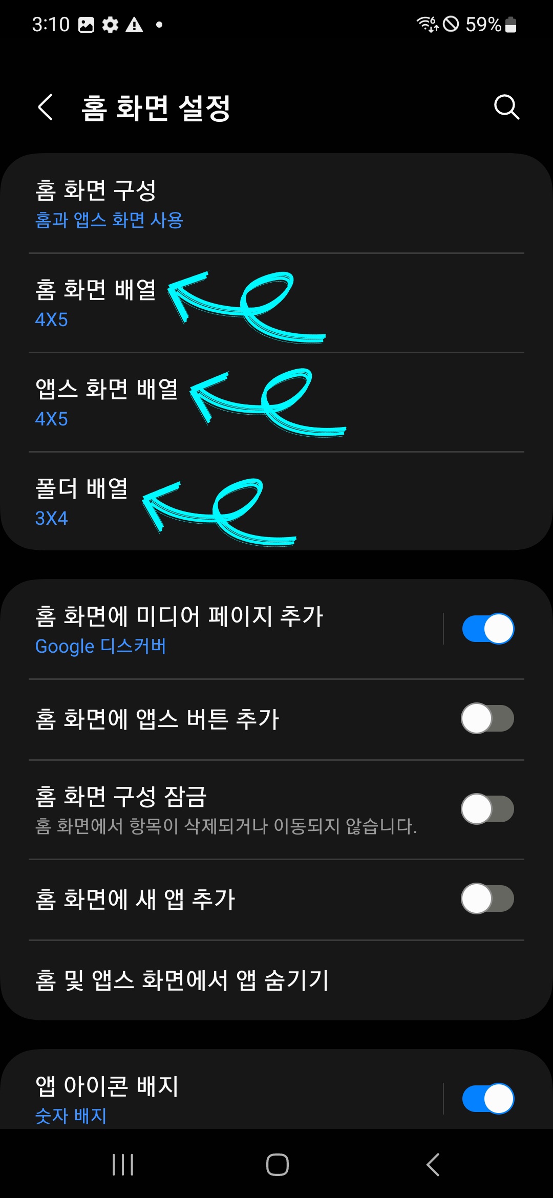 ▼그럼 홈 화면, 앱스 화면, 폴더 배열이 뜨는데요. 배열만 조절해주면 어플 측 아이콘 크기를 조절할 수 있습니다. 우선 홈 화면 배열을 클릭해 설정을 해보겠습니다.