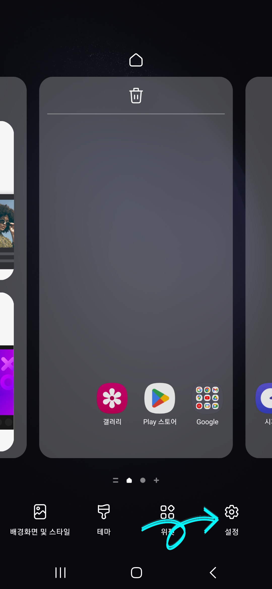 ▼그럼 핸드폰을 다양하게 꾸밀 수 있게 총 4가지 배경화면 및 스타일, 테마, 위젯, 설정이 뜨는데요. 그중 [설정]을 클릭해 줍니다.