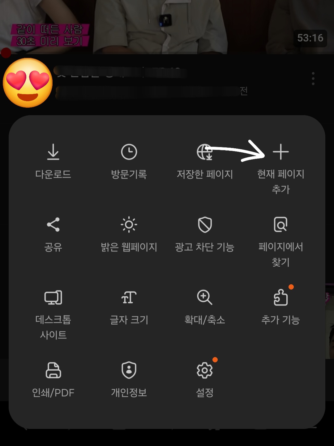 ▼그다음 자주 접속하는 사이트를 검색 후 하단 [≡(더 보기)] 클릭 후 [+ 현재 페이지 추가]를 클릭해 줍니다.