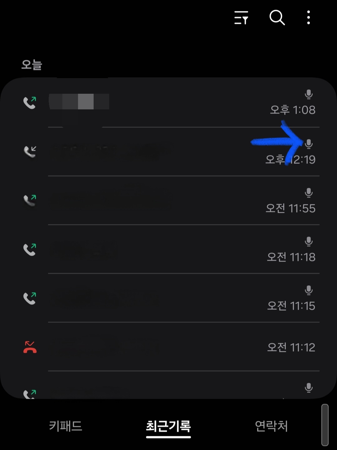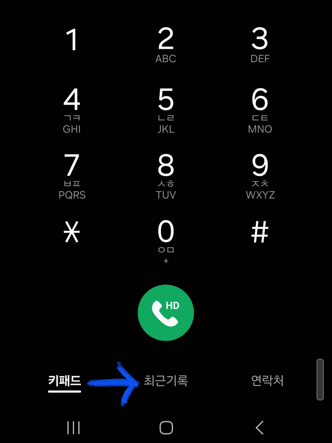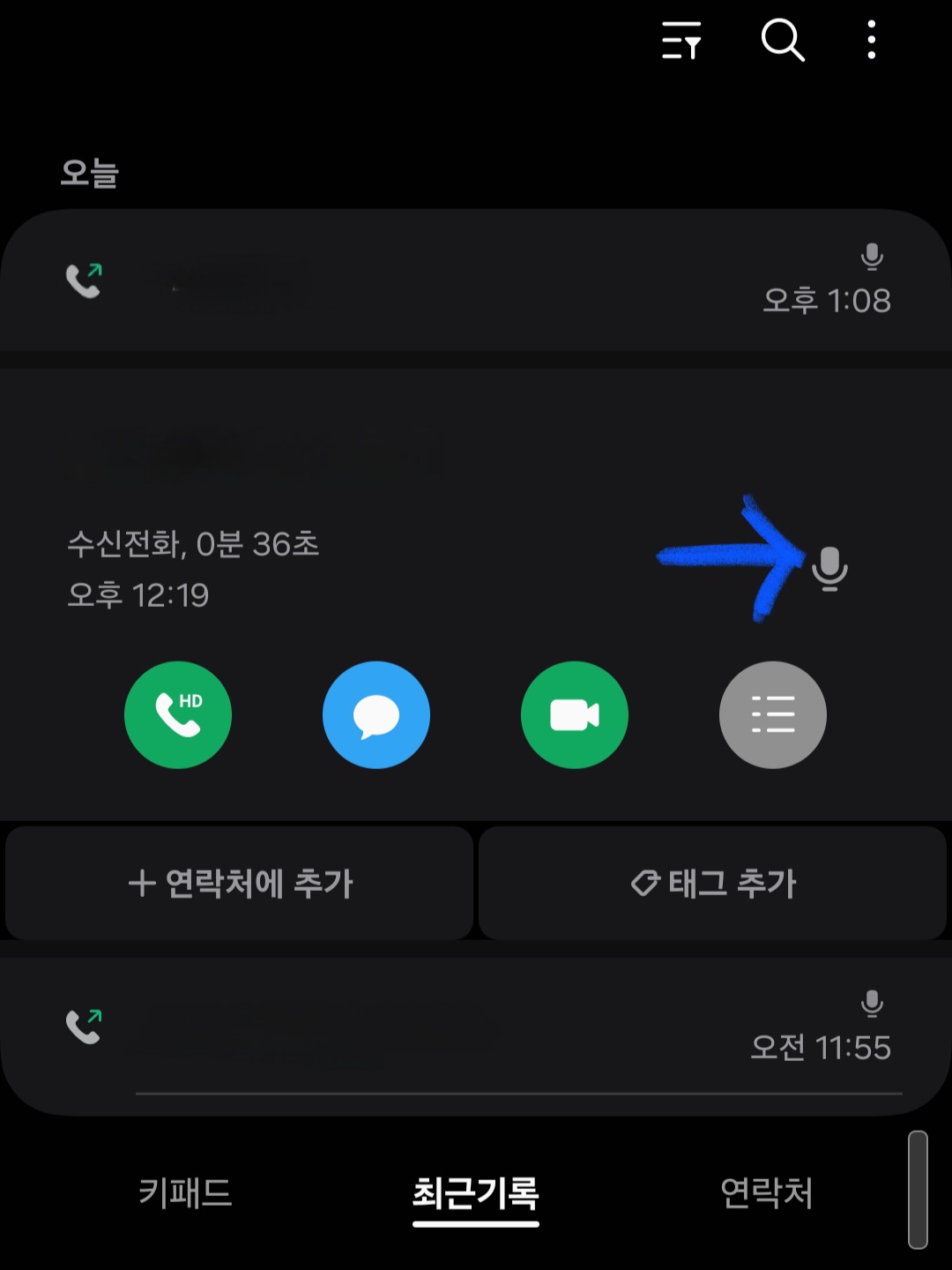 ▼만약 수동 녹음이나 혹은 자동 녹음 한 번이라도 했다면 이러한 방법으로도 확인할 수 있는데요. 전화앱을 클릭 후 [최근기록]을 클릭해 보세요.