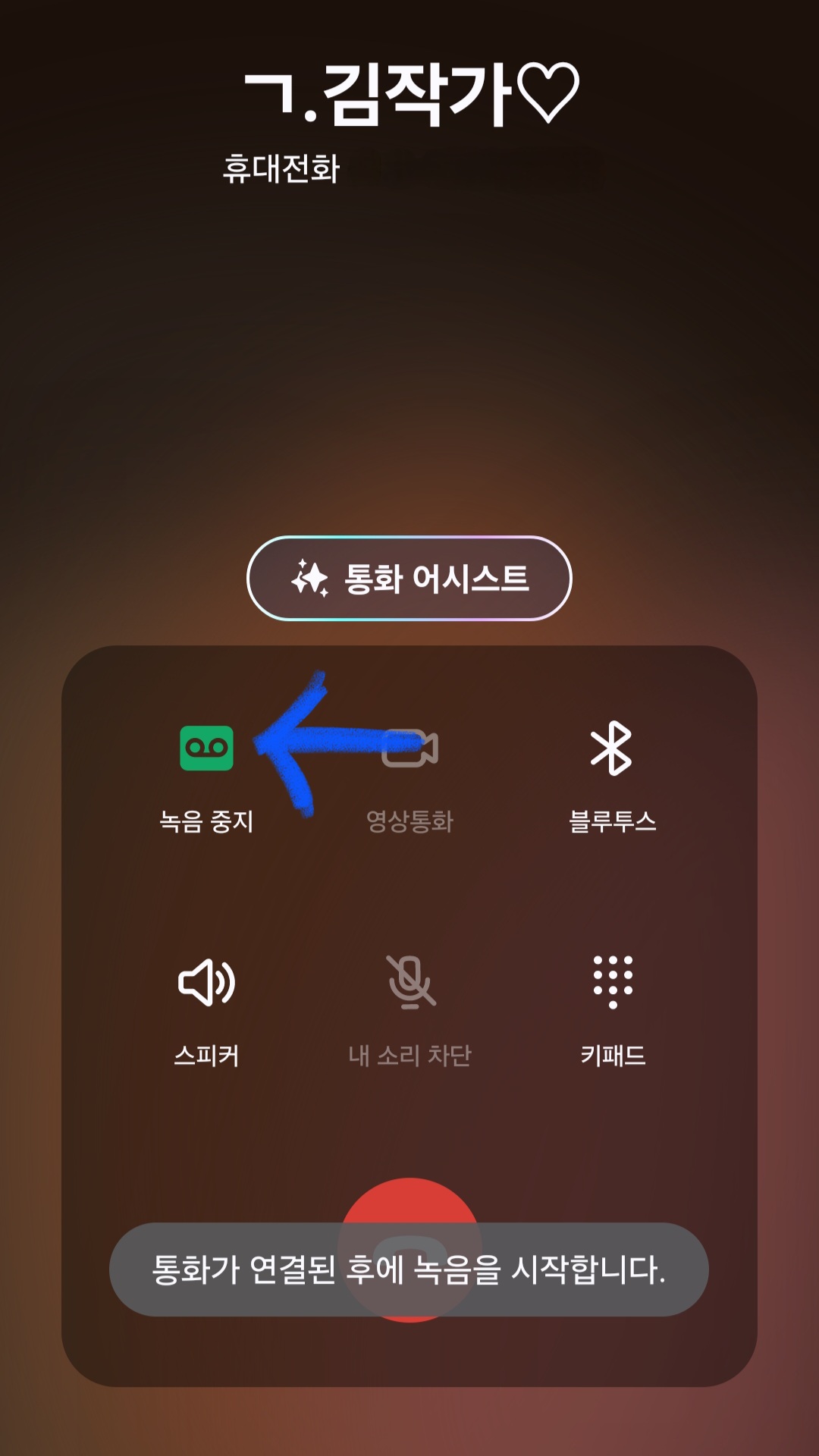 ▼우선 수동으로 통화녹음하는 방법 알아보겠습니다. 상대방한테 통화를 걸면 핸드폰 화면에 [녹음]이라고 써져 있을 겁니다.