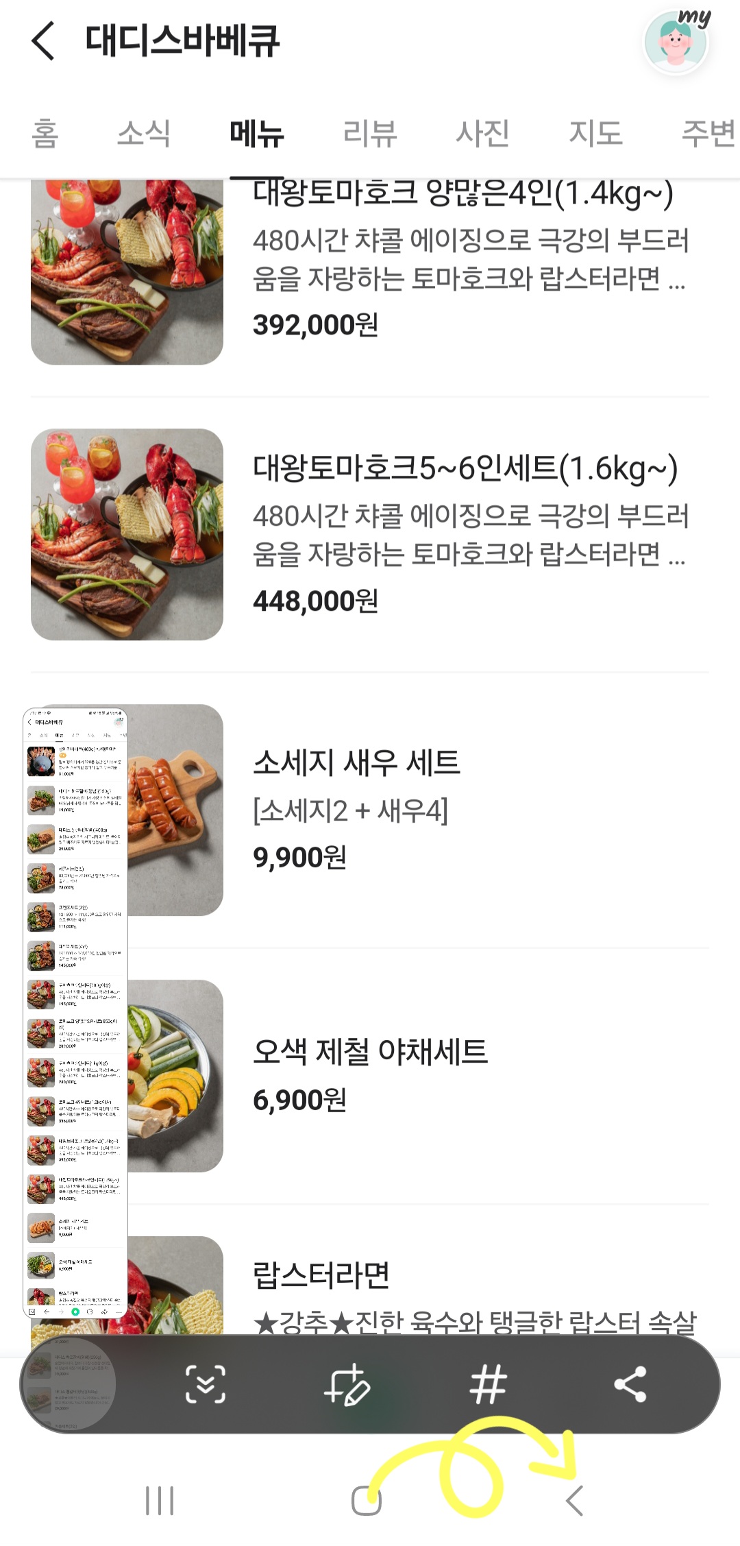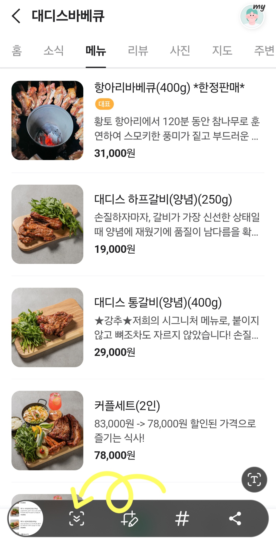 저는 최근에 여행 가서 맛있게 먹고 왔던 대디스바베큐 메뉴판을 스크롤 캡처해 봤는데요. 어떤가요? 편리하지 않나요? 이와 같이 다양한 방식으로 사용할 수 있는 캡처기능이니 활용해 보시길 바랍니다.