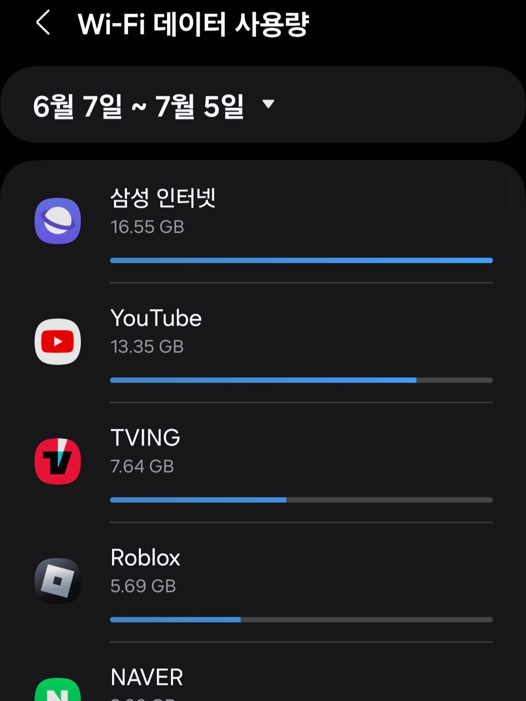 ▼밑으로 스크롤을 내리다 보면 어느 앱에서 몇 기가를 사용했는지 디테일하게 확인할 수 있습니다.