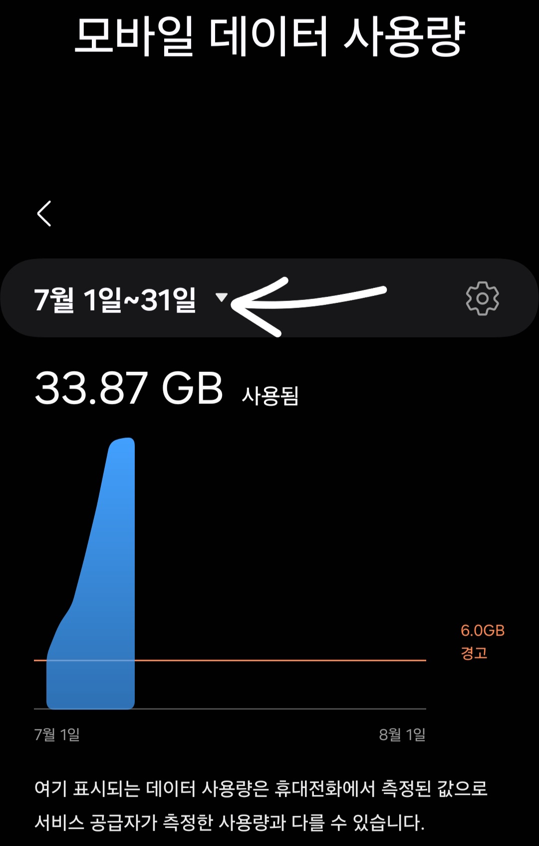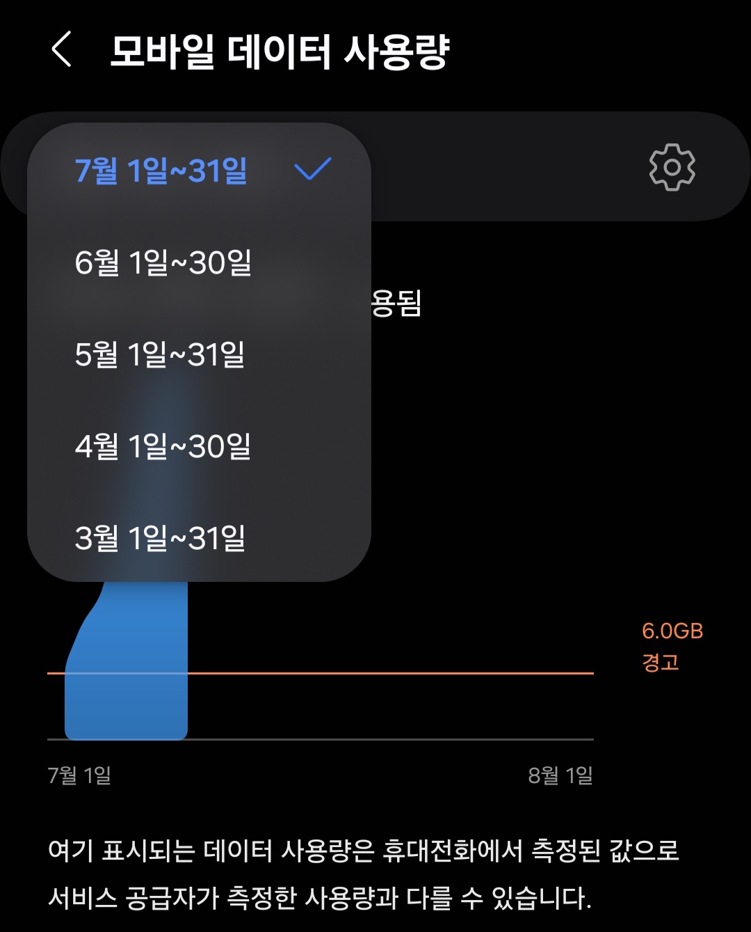 ▼그럼 아까랑 동일하게 현재까지 사용한 모바일 데이터가 뜨고 상단에 있는 [월, 일]을 클릭하면 현재 포함 총 5개월 전까지 확인할 수 있고