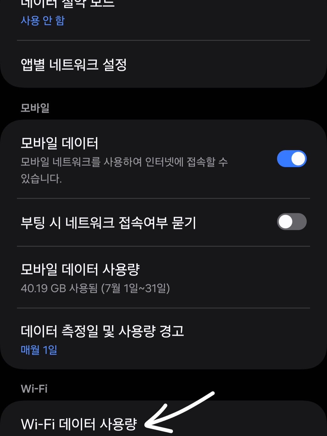 ▼모바일 데이터 사용량 외에도 Wi-Fi를 이용한 데이터 사용량 또한 확인하실 수 있는데요. 위에 있는 방법이랑 동일하게 [설정]-[연결]-[데이터 사용]을 클릭한 다음 스크롤을 아래로 쭉 내리면 [Wi-Fi 데이터 사용량]이 있을 겁니다. 그걸 클릭하면 Wi-Fi를 이용한 데이터 사용량 또한 확인할 수 있답니다.